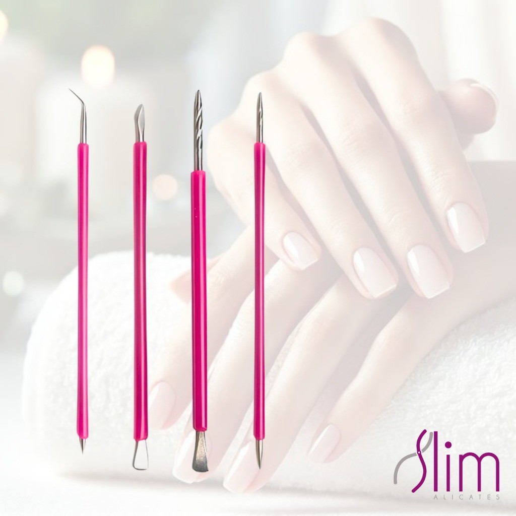 Kit Profissional de Cutelaria Manicure Slim Alicates com Cabo em Silicone ✔ Aço Inox 420C cirúrgico — NÃO enferruja ✔ 4 peças profissionais (palito, espátula, mista e desencravador) ✔ Ideal para manicure e podologia ✔ Afiação de fábrica — corte preciso ✔ Entregas rápidas ✔ Garantia Slim 12 meses