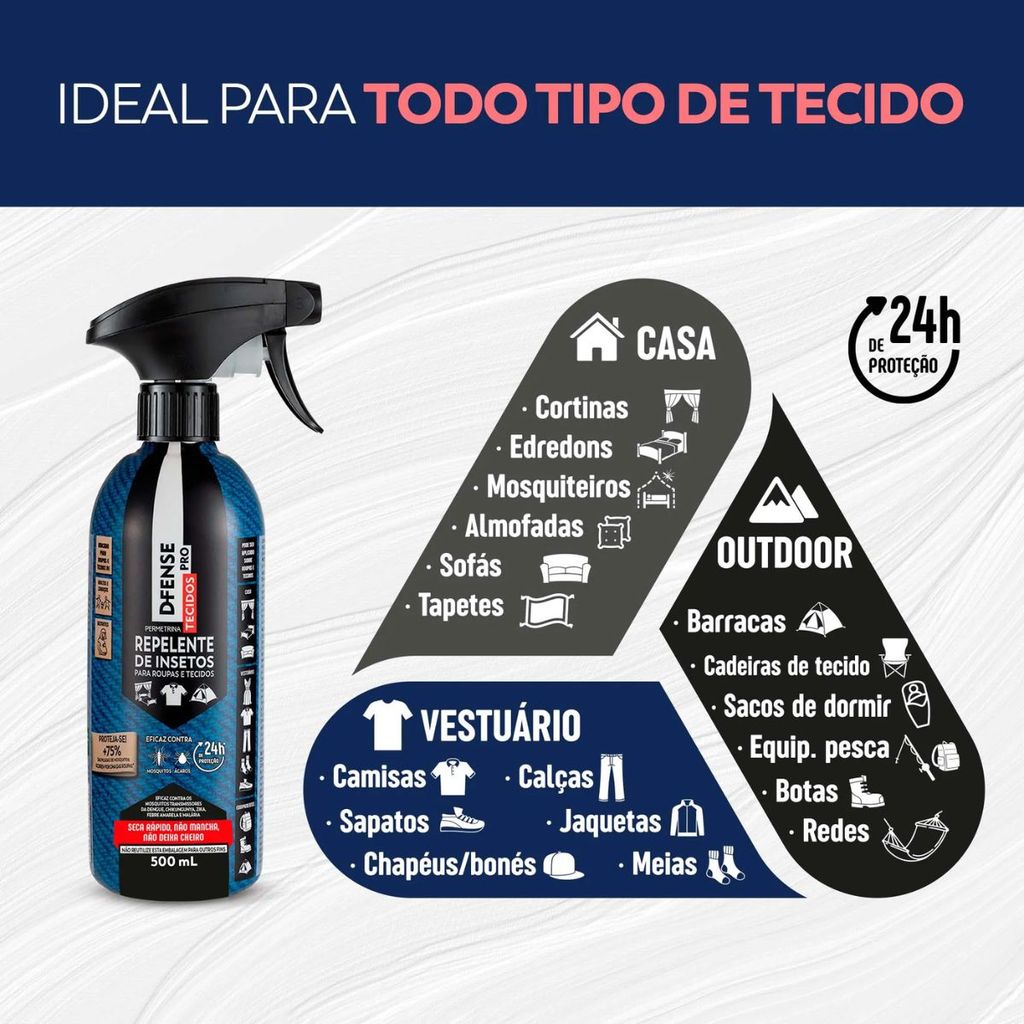 DESCRIÇÃO: D Fense Pro Repelente Spray Roupas Tecidos 500ml Haxea INDICAÇÃO DE USO: É ideal tanto para quem pratica atividades ao ar livre (pesca, caça esportiva, camping, trekking, ect.), quanto para quem quer ficar em casa tranquilo. São mais de 24 horas de proteção. Não mancha, não deixa cheiro e seca rápido. É seguro para gestantes, adultos e crianças de qualquer idade. É eficaz contra mosquitos, carrapatos, ácaros, traças entre diversos outros insetos. Protege você e sua família dos mosquitos transmissores da Zika, Dengue, Chikungunya, Malária e Febre Amarela por mais de 24 horas. Você sabia que mais de 75% das picadas de mosquitos acontecem por cima das roupas? D-Fense Pro Tecidos é o primeiro repelente para roupas e tecidos aprovado pela Anvisa no Brasil. Utiliza da mesma tecnologia usada pelo exército americano em atividades na selva há mais de 30 anos e é recomendado pela Associação Americana de Ginecologia e Obstetrícia para ser utilizado em roupas de gestantes para a prevenção das doenças Zika, Dengue e Chikungunya. MODO DE USAR: Pode ser usado em roupas em geral, camisetas, vestidos, bermudas, calças, meias, sapatos, botas, bonés, chapéus, além de outros tecidos como sofás, tapetes, almofadas, travesseiros, cortinas, roupas de cama, mosquiteiros, barracas de camping, sacos de dormir, equipamentos de pesca e muito mais. Vestuário (roupas em geral), Casa (cortinas, tapetes, almofadas, sofás, edredons, etc.) e Outdoor (barracas, sacos de dormir, redes, equipamentos de pesca, etc.) ------------------------------------------------------------------------------------------------- A MANADA ANIMAL é um marketplace de produtos veterinários. É a escolha certa para tutores que prezam pela qualidade dos produtos que seu animal necessita. Tudo com o suporte de uma equipe de veterinários e gestores com mais de 10 anos de experiência no mercado. Fique tranquilo, todos os nossos produtos são originais, adquiridos através de distribuidores credenciados! Ah, e todas as vendas acompanham nota fiscal! MANADA ANIMAL, Tranquilidade pra você, cuidado para ele!