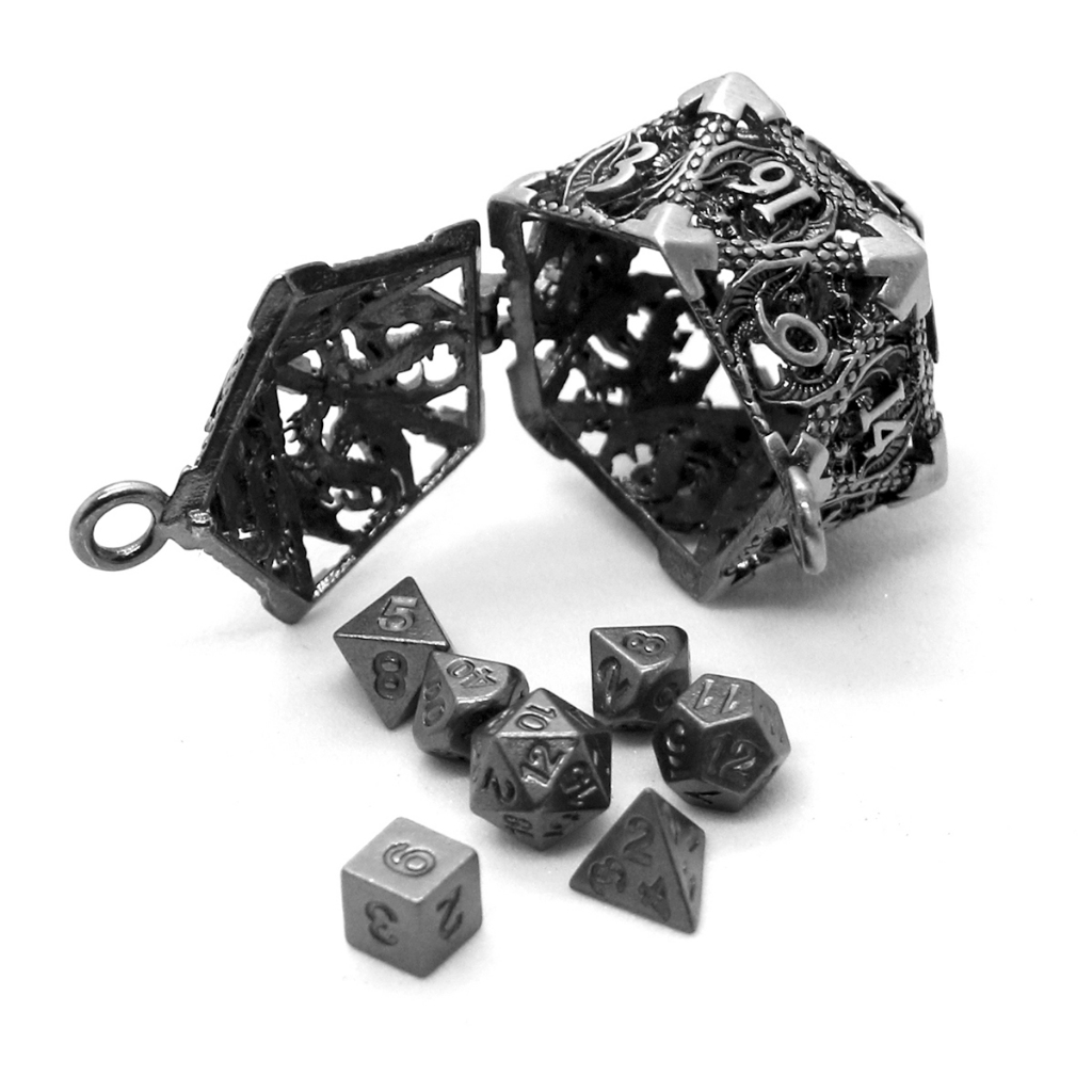 D20 Caixa Oca de Metal + Conjunto de 7 Dados de Metal, Kit Mini Dados de Jogo de Tabuleiro Portátil