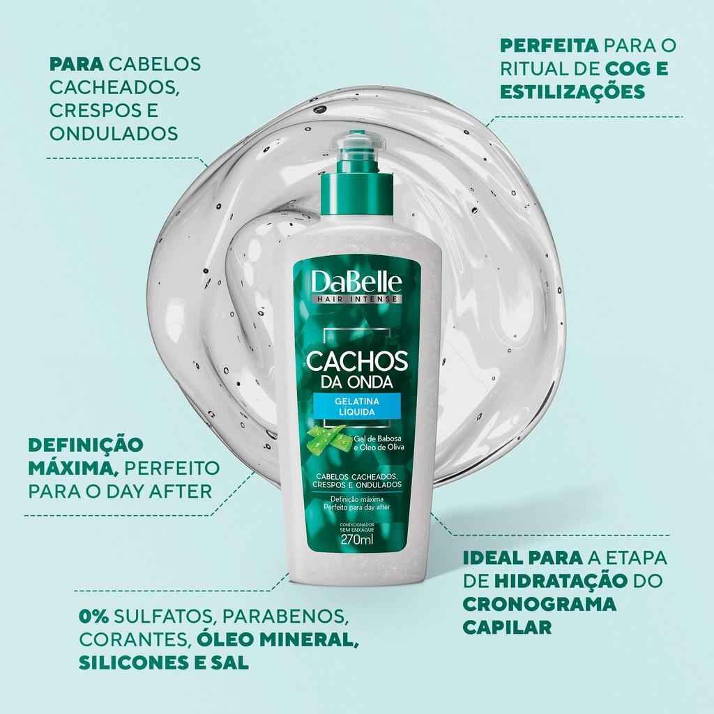O que ele tem: - Shampoo 250ml: O Shampoo Cachos da Onda DaBelle Hair remove as impurezas e resíduos de produtos enquanto prepara o cabelo para os próximos passos do tratamento. É o primeiro passo para exibir cachos e crespos definidos e cheios de onda. Melhor shampoo para cabelos cacheados e finos: ajuda no cuidado dos fios cacheados mais finos, pois garante uma carga extra de reposição dos nutrientes, deixando os fios limpos, brilhosos e com definição. O Shampoo Cachos da Onda limpa sem ressecar os fios e ainda garante uma dose de nutrição e hidratação que o cabelo ressecado precisa. - Condicionador 175ml: Condicionador DaBelle Hair Cachos da Onda desembaraça os fios e confere mais maleabilidade .Alinha as cutículas para ativar os cachos a curvatura dos fios. Deixa as mechas com movimento e toque sedoso. Você consegue exibir cachos e crespos definidos e cheios de onda. - Creme de Pentear 270g: DaBelle Hair Cachos da Onda Creme de Pentear desembaraça, modela e ativa os cachos, além de ter proteção térmica. É perfeito para as técnicas fitagem ou que misturam com produtos de diferentes texturas, como o COG - creme de pentear (C), óleo (O) e gelatina (G) - e o LOC - líquido (L), geralmente água, óleo (O) e creme de pentear (P).O Creme de Pentear DaBelle Hair Cachos da Onda condiciona, facilita o pentear e a modelagem dos cachos. Use e abuse para manter os cachos hidratados, definidos, perfumados e dar aquele acabamento perfeito. - Máscara Capilar 800g: A Máscara Cachos da Onda DaBelle Hair tem alto poder de hidratação, vital para a saúde dos cachos e crespos. Trata na profundidade da fibra capilar, condiciona, devolve a carga lipídica natural, reativa a curvatura dos fios que perdem forma com a desidratação e resgata a definição que deixa os cachos deslumbrantes. - Óleo Capilar 45ml: Óleo Mágico DaBelle Hair Oliva e Babosa é perfeito para umectar e nutrir profundamente os fios. Também possui filtro UV e proteção térmica.Óleo Mágico DaBelle Hair Oliva e Babosa é super versátil porque pode ser utilizando tanto para tratar quanto finalizar os fios. Ele ajuda a proteger os fios do calor e do sol, condiciona, mantêm o penteado no lugar, define os cachos e adicionar aquele brilho extra. Tem tamanho perfeito pra levar na bolsa e válvula que facilita a dosagem e a aplicação. Use e abuse sempre que precisar! - Gelatina Modeladora 270ml: A Gelatina Líquida Cachos da Onda é coringa para dar aquela turbinada na definição e condicionamento dos cachos. Perfeita para o ritual do COG, vai ser sua melhor amiga no day after pra você tirar onda com cachos e crespos de cair o queixo! - Tônico Fortalecedor 100ml: Enriquecido com vitaminas e biotina para fortalecer e hidratar o couro cabeludo, além de auxiliar no combate à queda*. É uma ajuda extra no crescimento dos fios, não é incrível? - Ativador de cachos 270ml: O Ativador de Cachos da Onda é um forte aliado para quem ama dar mais definição, brilho e condicionamento aos cachos e crespos. Perfeito para modelar, hidratar, e ativar a curvatura que dá forma aos seus cachos, nutre até os fios mais ressecados, controla o frizz e o volume.DaBelle Hair Gelatina Jujuba de Morango 5000g: A Gelatina Jujuba de Morango é nutrição potente da raiz às pontas!Com textura levinha e ação antifrizz, define sem pesar, trata enquanto modela e deixa os fios soltinhos, macios e cheios de vida.Use sozinha ou nas misturinhas com creme ou óleo para definição por até 72 horas, com muito brilho e vitalidade. Gel de Babosa: Também conhecida como Aloe Vera, a Babosa é rica em nutrientes com alto poder de hidratação. Não é a toa que é a queridinha dos fios com todas as curvaturas, porque ajuda a dar aquela definição poderosa, além de fortalecer os cabelos.Óleo de Oliva: Rico em ácidos graxos e vitamina E, possui ação hidratante e antioxidante. Fortalece os fios e adiciona uma dose extra na nutrição e maciez que os cachinhos tanto precisam.