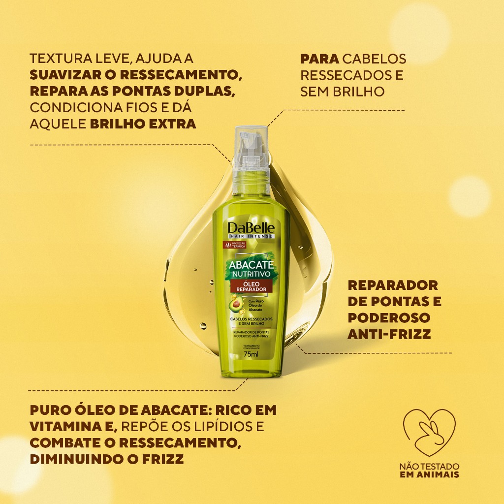 O Kit Óleos Mágicos DaBelle oferece uma seleção de óleos naturais para nutrir, hidratar e reparar os cabelos, proporcionando fios mais saudáveis, brilhantes e macios. Óleo Rosa Mosqueta - Óleo Mágico Este óleo possui ação antioxidante e cicatrizante, suavizando a superfície dos fios e restaurando a massa capilar perdida. Ideal para cabelos que necessitam de reparação profunda, devolve vitalidade e brilho aos cabelos danificados. Óleo de Jojoba - Óleo Mágico Com textura leve, o Óleo de Jojoba garante maciez e brilho aos cabelos sem deixá-los pesados. Promove nutrição profunda, combate o ressecamento e alinha os fios, eliminando a opacidade para um aspecto saudável. Óleo Reparador - Milagres do Mel Enriquecido com extrato de mel, este óleo reparador hidrata profundamente e repara os danos dos fios, proporcionando maciez e brilho intensos. Indicado para cabelos secos e danificados, devolve a vitalidade e a saúde dos cabelos. Óleo Reparador - Abacate Nutritivo Formulado com óleo de abacate, este óleo reparador nutre intensamente os fios, combatendo o ressecamento e proporcionando maciez e brilho. Ideal para cabelos secos e opacos, restaura a vitalidade e a suavidade dos cabelos. Blend de Óleos - Óleo Mágico Uma poderosa sinergia de Argan, Abacate, Macadâmia, Girassol e Linhaça, formulada para proteger, nutrir e reparar profundamente os fios. Ideal para todos os tipos de cabelo, garante reparação intensa, maciez e brilho. Óleo Rícino - Óleo Mágico Fortalece e encorpa os fios, auxiliando no crescimento saudável. Indicado para cabelos fracos e quebradiços, traz força, vitalidade e proteção contra danos solares com filtro UV. Óleo Multiprotetor - Óleo Mágico Este óleo oferece múltiplas proteções para os cabelos, incluindo proteção térmica e UV. Ideal para cabelos expostos a agressões diárias, mantém os fios saudáveis, protegidos e com brilho intenso. Óleo Babosa e Oliva - Óleo Mágico Combinação perfeita para nutrição e definição dos cabelos cacheados a crespos. Fortalece os fios, aumenta a elasticidade e garante proteção UV, deixando os cachos mais definidos e hidratados. Óleo Coco - Óleo Mágico Possui ação emoliente que potencializa a hidratação dos fios secos e ressecados. Ideal para cabelos normais a secos, promove suavidade, maciez e proteção contra os danos solares com filtro UV. Modo de Uso: Aplique uma pequena quantidade do óleo escolhido nas mãos e distribua uniformemente pelo comprimento e pontas dos cabelos úmidos ou secos, evitando a raiz. Reaplique sempre que desejar. Para umectação, aplique uma quantidade maior do meio até as pontas e deixe agir durante a noite; pela manhã, lave normalmente. Os óleos também podem ser utilizados em misturas com cremes de pentear ou ativadores de cachos. Com proteção térmica e UV, são ideais para aplicação antes do uso de fontes de calor ou exposição ao sol.