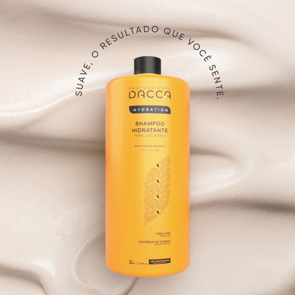 Kit Cronograma Capilar Profissional Dacca. O Shampoo Hidratante Dacca hidrata, repara danos e dá brilho aos cabelos, especialmente os secos e quimicamente tratados, com trealose e proteína da quinoa. A Hidratação Intensiva Dacca cuida dos cabelos com trealose, proteína da quinoa, 7 óleos naturais e açúcar do beterraba. Indicado para fios secos, quimicamente tratados e danificados. A Máscara de Reestruturação Intensiva Dacca reconstrói e hidrata fios danificados com queratina biomimética, aminoácidos e flor da ressurreição. A Nutrição Intensiva Cacau Raiz Dacca hidrata e nutre cabelos danificados com manteiga de cacau, aminoácidos e antioxidantes, proporcionando brilho e restauração. Contém: 01 Shampoo Pós Química Hidratante Dacca 1 Litro - ANVISA: 25351.426121/2021-61 01 Hidratação Intensiva Dacca Profissional 500g - ANVISA: 25351.430084/2021-96 01 Reconstrução Dacca Profissional 500g - ANVISA: 25351.210632/2021-63 01 Nutrição Cacau Raiz Dacca Profissional 500g - ANVISA: 25351.262738/2024-95 Não testamos em animais.