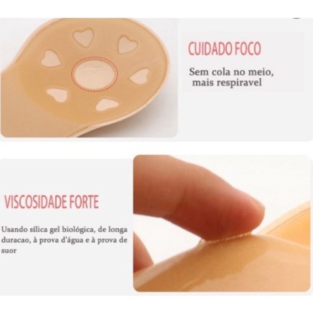 Descrição Do Produto Atualmente o MELHOR adesivo modelador de seios do mercado! Ele gruda muito bem e consegue ser removido sem agredir a pele. Permite o uso de decote frontal total, deixando as costas livres, trazendo assim um melhor aspecto nos looks decotados e levanta qualquer tipo de seios. Basta seguir as orientações do fabricante. tamanho normal O comprimento e a largura são iguais. A diferença é que há uma pequena diferença no ajuste do copo. Os tamanho tem a forma um pouco mais arredonda isso faz com que ele fique um pouco mais elevado. COMPOSIÇÃO: Interno: 100% Silicone Medicinal. Externo: Revestimento em Algodão. Nossa prioridade será sua satisfação. Sua avaliação será muito importante para nós!🙏🏻