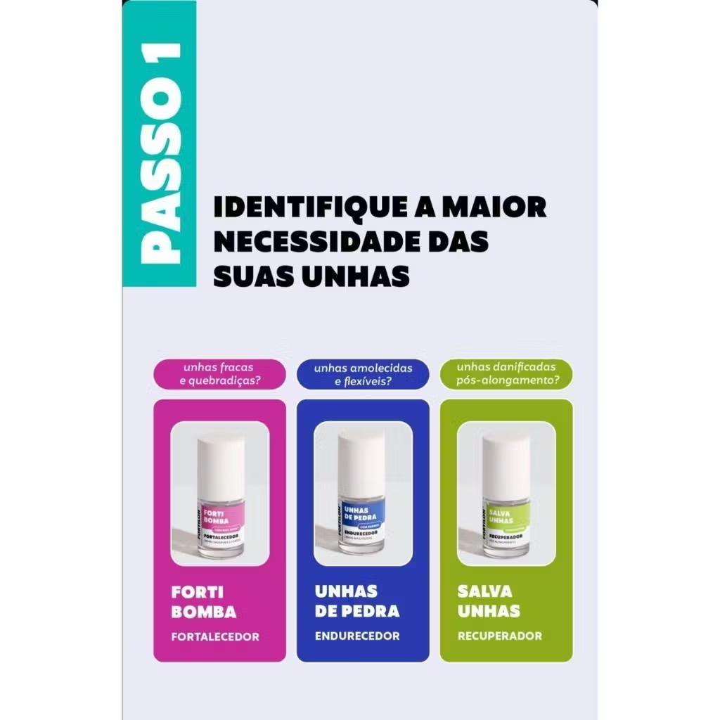 KIT COMPLETO DE TRATAMENTO ENDURECEDOR - FORTILON DAILUS 1- UNHAS DE PEDRA A base UNHAS DE PEDRA é um potente endurecedor, ideal para deixar mais rígidas unhas que estão amolecidas e flexíveis. Com fórmula premium e de alta performance, esse produto de tratamento é enriquecido com formol, D-pantenol e óleo de cravo, resultando em unhas saudáveis e incríveis. 2- O kit BLINDA UNHAS cria um verdadeiro escudo protetor nas unhas, tornando-as mais espessas e resistentes à quebra, descamação e batidas em apenas 2 passos. No primeiro, a base Resistência cria um escudo de fibras de nylon, uma camada extra para as unhas fazendo com que elas fiquem mais grossas. Na sequência, a base Niveladora proporciona uma superfície lisa e fosca, cobrindo a textura das fibras com ACEMATT® OK 412, uma sílica de alta transparência que deixa as unhas uniformes e com toque suave. 3- A base SALVA UNHAS foi especialmente desenvolvida pra recuperar e reconstruir as estruturas desgastadas, descamadas e danificadas das unhas pós-alongamento. Com fórmula premium e de alta performance, esse tratamento é enriquecido com biotina, vitamina E e Nail Hero™, resultando em unhas saudáveis e incríveis. 4- A base FORTI BOMBA de Fortilon é um poderoso fortalecedor indicado para estimular o crescimento saudável de unhas fracas e quebradiças. Com fórmula premium e de alta performance, esse tratamento é enriquecido com Nail Hero™, queratina e cálcio, resultando em unhas saudáveis e incríveis. 5- OLEO VITA C POWER: Ideal pra finalizar seu ritual de tratamento, o óleo VITA C POWER de Fortilon entrega a nutrição, hidratação e prevenção que suas unhas e cutículas precisam pra ficarem sempre saudáveis e radiantes.