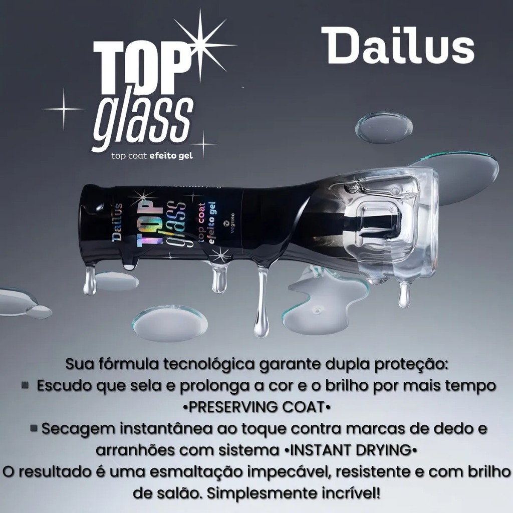 Esmalte Top Coat Efeito Gel - Kit com 6 Unidades Conquiste uma esmaltação em gel sem precisar de cabine. Especialmente desenvolvido com resina PREMIUM Avançada com reflexão máxima, nosso Top Coat TOP GLASS entrega resultado profissional com efeito gloss radiante e duradouro. - Brilho extremo e acabamento espelhado - Secagem instantanea.