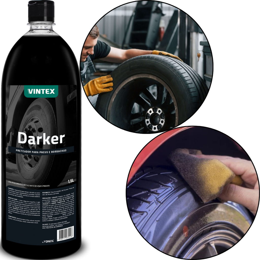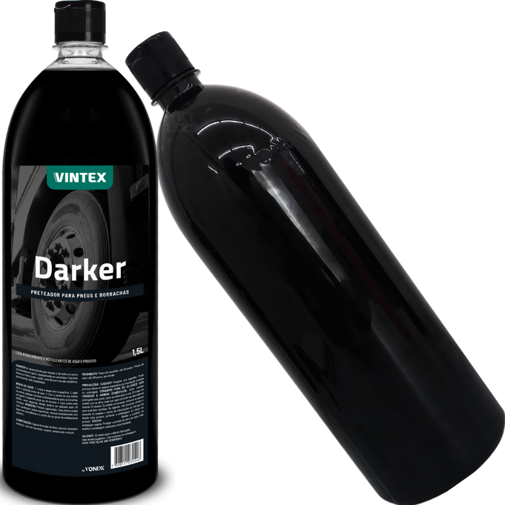 Este anúncio contém: 1 (um) Pretinho para pneus e borrachas Darker 1500ml original da marca Vonixx. Código do Fabricante: Darker/2010027; Código Universal: 7898511034446. Sobre o produto: DARKER foi desenvolvido para renovar e dar brilho em pneus e borrachas em geral, especialmente em caminhões. O produto forma um filme preto, sólido, semi-flexível e de alta resistência, promovendo alta durabilidade. Resistência; Alta durabilidade; Filme 100% seco; Não gruda poeira; Fácil de aplicar; Não ataca as borrachas por ser base d'água. Modo de usar: Limpe e seque bem a superfície; Agite bem o produto antes de usar; Com o auxílio de uma trincha ou pincel, aplique o produto uniformemente no pneu ou borrachas em geral e aguarde secar por 30 minutos; Caso queira mais brilho, uma segunda demão poderá ser aplicada após 30 minutos. Dúvidas frequentes: 1 - Trabalhamos apenas com produtos novos, e com garantia; 2 - Produto a pronta entrega; 3 - Seus produtos serão enviados em até 24 horas úteis após a confirmação do pagamento. Sobre a empresa: Somos uma Auto Peças fundada em 1980, atuamos no mercado varejista de peças e acessórios, tendo como principais clientes oficinas mecânicas e consumidor final. Não achou o que procura? Ficou com alguma dúvida sobre o produto? Fale conosco através do campo de perguntas.