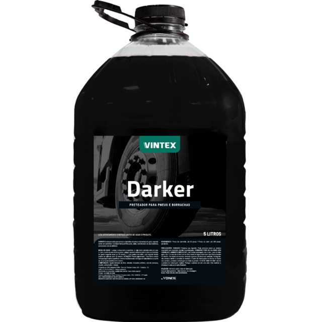 DARKER 5L - PRETEADOR PARA PNEUS E BORRACHAS VINTEX DESCRIÇÃO: Darker foi desenvolvido para renovar e dar brilho em pneus e borrachas em geral, especialmente em caminhões. O produto forma um filme preto, sólido, semi-flexível e de alta resistência, promovendo alta durabilidade MODO DE USO: 1. Limpe e seque bem a superfície 2. Agite bem o produto antes de usar 3. Com o auxílio de uma trincha ou pincel, aplique o produto uniformemente no pneu ou borrachas em geral e aguarde secar por 30 minutos 4. Caso queira mais brilho, uma segunda demão poderá ser aplicada após 30 minutos