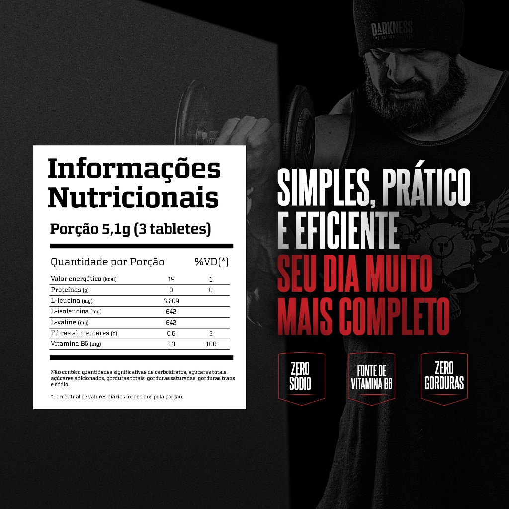 Darkness BCAA Fix 4500 combina 4500 mg de aminoácidos essenciais (BCAA) por dose, incluindo 3209 mg de leucina, com a qualidade PURE AMINO ACID by AJINOMOTO Co.®. Ideal para quem busca desenvolvimento muscular extremo e alta performance. Rico em aminoácidos de cadeia ramificada (L-valina, L-leucina e L-isoleucina), o BCAA Fix 4500 otimiza a síntese proteica, essencial para recuperação muscular e maior resistência em treinos intensos. A fórmula ultraconcentrada em tabletes facilita o consumo no dia a dia. Com 3 tabletes por dia, o BCAA Fix atende às necessidades de suplementação de atletas de alto desempenho, seja antes ou após o treino. Além dos BCAAs, contém vitamina B6, essencial para o metabolismo energético e a absorção de aminoácidos, oferecendo suporte completo para treinos mais intensos e resultados mais rápidos. Na Darkness, acreditamos na superação constante. Inspiramos atletas a enfrentar desafios únicos com determinação, conectando corpo e mente em uma jornada de evolução. Cada esforço reflete nosso compromisso: oferecer produtos que impulsionam desempenho, promovem resultados e fortalecem sua capacidade de ir além.