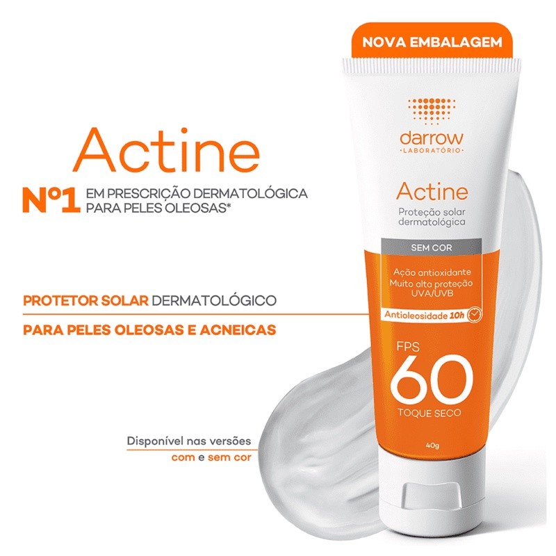 Darrow Actine Protetor Solar Fps60 40g Actine Protetor Solar FPS 60 possui muito alta protecao UVA/UVB em uma textura leve de absorcao imediata que garante 10h de antioleosidade para a sua pele, alem de acao antioxidante prevenindo o envelhecimento. Nao desobstrui os poros, sendo ideal para as peles oleosas e acneicas. Modo de usar: Antes de iniciar o uso, remover o involucro para abrir a tampa. Nao usar se o involucro estiver violado. Aplique abundantemente antes da exposicao ao sol. Reaplicar sempre, apos sudorese intensa, nadar ou banhar-se, secar-se com toalha e durante exposicao ao sol. E necessaria a reaplicacao do produto para manter a sua efetividade. Se a quantidade aplicada nao for adequada, o nivel de protecao sera significativamente reduzido. Ajuda a prevenir as queimaduras solares. Sobre a marca: A Darrow Dermocosmeticos e uma marca brasileira de dermocosmeticosque se preocupa em oferecer aos consumidores produtos comprovadamente eficazes, acessiveis e adaptados para as peles brasileiras. Presente ha mais de 50 anos no mercado, possui a expertise reconhecida no segmento de higienizacao.