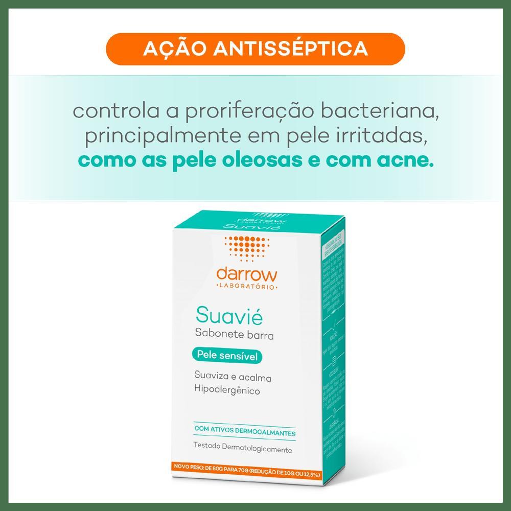Sabonete em barra para peles sensíveis ou sensibilizadas. Darrow Suavié preserva a barreira cutânea durante a limpeza e acalma. O Sabonete em Barra DarrowSuaviépossui fórmula hipoalergênica e dermatologicamente testada que minimiza as irritações, mantém o rosto suave e higieniza, sem provocar vermelhidões e ressecamento. Ideal para uso diário. **** IMPORTANTE: Não vendemos para contas CNPJ, evite que seu pedido seja cancelado! ****