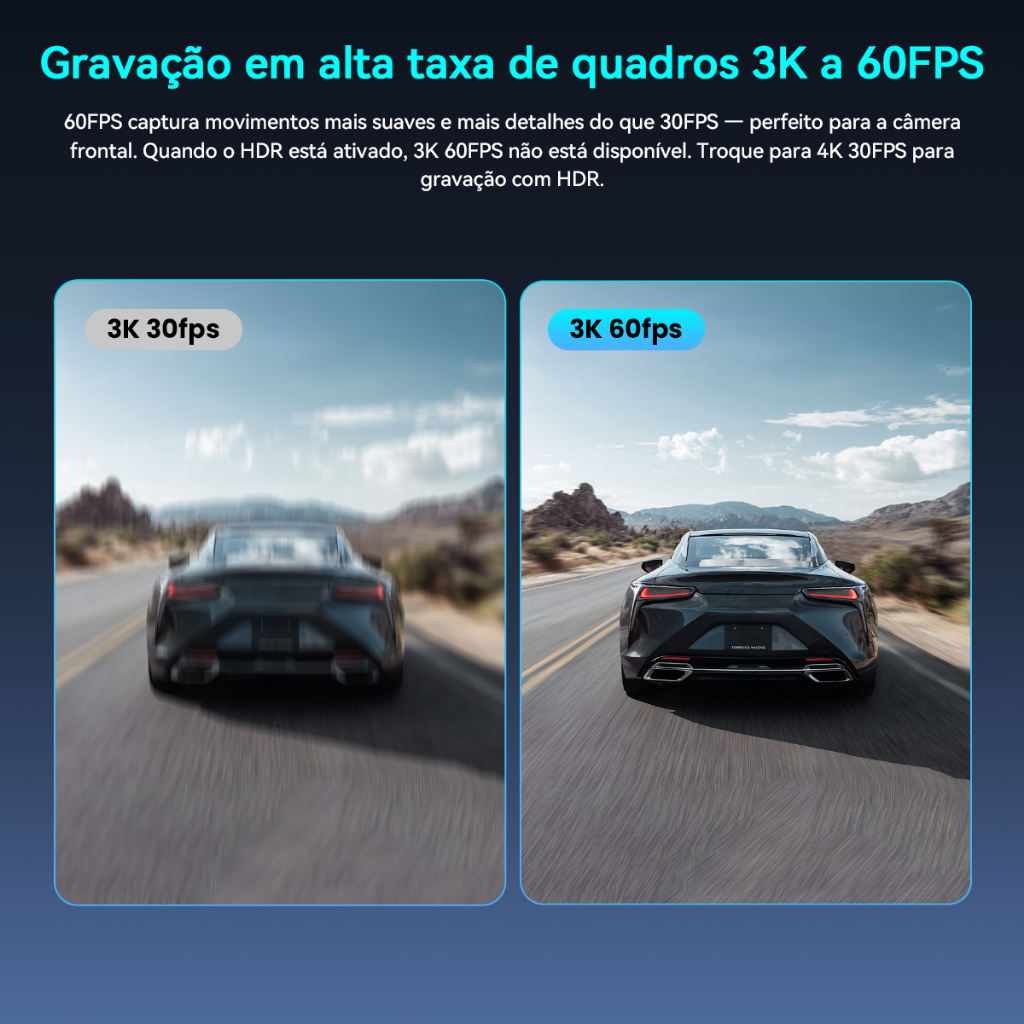 DDPAI Z60 Pro Câmera Veicular 3 Canais 4K+ 2K+ 1080P, STARVIS 2 IMX678 IMX662, HD com 32G eMMC, 3K/60FPS, Suporte 4G LTE, WiFi 5G, GPS, Tela IPS de 3", Visão Noturna, Modo de Estacionamento 24H ================NOTA================ 1. A monitoramento de estacionamento em tempo real requer a compra separada de uma caixa 4G, cartão SIM e um novo cabo inteligente de redução de tensão. A Caixa em Nuvem 4G precisa ser usada com o kit de alimentação Type-C ou OBD para ativar as funcionalidades. 2. A câmera de painel de 3 canais (Frontal + Traseira + Interior) requer 2 cartões de memória. 3. A câmera interior (MINI 2X) na câmera de painel de 3 canais NÃO suporta recursos 4G. Os recursos 4G são suportados SOMENTE para as câmeras frontal e traseira. -- É necessário um cartão micro SD formato Class 10 ou micro SD U3 para vídeos em alta resolução. (Nota: o cartão SD não está incluído. Procure um cartão SD na loja). Não utilize cartões "SanDisk Ultra" de outros fornecedores ou cartões "Generic Class 10 for HD Video". ========= Detalhes do produto ========= - Modelo: Z60 Pro 3 Canais - Especificações: 5V=2A - Resolução: 3840 x 2160 @ 30fps HDR, 2880 x 1620 @ 60fps (Frontal) 1920 x 1080 @ 30fps HDR (Traseira) 2560x1440P @ 30fps (Interno) - Câmera: STRAVIS 2 IMX678 8,3 Megapixels CMOS Sensor (Frontal) STRAVIS 2 IMX662 2,4 Megapixels CMOS Sensor (Traseira) - Lente: F1.75, campo de visão de 138°, 63P (Frontal) F1.55, campo de visão de 138°, 2G4P (Traseira) F1.55, campo de visão de 123°, 2G4P (Interno) - Codificação de Vídeo: AI.265 & H.264 - Formato de Vídeo: MP4 - IMU: Sensor G de 3 eixos - Supercapacitor: Suportado - Armazenamento:32GB eMMC interno, até 512GB de cartão MicroSD externo - Wi-Fi: Wi-Fi Turbo 5GHz - Bluetooth: BLE5.1 - GNSS: Suporta GPS, BDS, GLONASS, GALILEO, QZSS - Dimensões: 8364,736,5mm - Peso: 190g - Display: Tela de 3 polegadas - Interface de Energia: USB Tipo-C - Temperatura de Operação: -20°C ~ 70°C - Temperatura de Armazenamento: -40°C ~ 85°C ============== Descrição ============== 1. Gravação de 3 Canais Através da tecnologia Link do DDPAI Z60 Pro, suporta gravação 4K+2K+1080P na frente, interior e traseira. Após a conexão com a tecnologia Link, o dispositivo sincroniza automaticamente, permitindo que você gerencie e visualize vídeos de múltiplos ângulos simultaneamente através do aplicativo DDPAI. 2. Qualidade de Imagem Excepcional Utilizando as câmeras Sony STARVIS 2 IMX678 na frente e IMX662 na traseira, o Z60 Pro 3 canais oferece qualidade de imagem excepcional, com gravação frontal em 4K e traseira em 1080P, ambas com função HDR para garantir imagens de alta qualidade em qualquer condição de luz. 3. Aumento da Visão Noturna Com a avançada tecnologia NightVIS 2.0 da DDPAI e processamento de imagem AI ISP, o Z60 Pro melhora significativamente a visão noturna, proporcionando imagens de estacionamento mais brilhantes e nítidas, mesmo em ambientes extremamente escuros. 4. Suporte a Monitoramento Remoto 4G LTE Através da conexão 4G, você pode receber notificações instantâneas no aplicativo DDPAI, incluindo localização, hora e imagens. Caso ocorram eventos anormais, imagens e capturas serão automaticamente enviadas para a nuvem. Através do aplicativo DDPAI, você pode visualizar e baixar arquivos facilmente, garantindo a segurança dos dados. Nota: A funcionalidade completa 4G requer a compra separada do "Módulo 4G" e "hardwire kit". 5. Proteção de Armazenamento Duplo com eMMC de 32GB Integrado Utilizando a tecnologia D²save 2.0, o Z60 Pro possui 32GB de memória eMMC integrada e suporta até 512GB de microSD. Caso ocorra falha no cartão microSD, a gravação será automaticamente transferida para o armazenamento interno para proteger dados importantes. 6. Monitoramento de Estacionamento 24 Horas Sistema de monitoramento de estacionamento 24 horas, com um sistema de gerenciamento de energia IPS que detecta automaticamente a voltagem do veículo para evitar o consumo da bateria. O modo Time-Lapse economiza espaço de armazenamento, e o modo de detecção de colisões ativa automaticamente a gravação em alta resolução para registrar momentos críticos no caso de um acidente, protegendo seu veículo, mesmo sem vigilância. Nota: Requer a compra separada do "hardwire kit" (DDPAI IPS Intelligent Hardwire Kit for Z60 Pro). 7. Gravação em Alta Velocidade Gravação em 3K a 60fps, garantindo imagens fluídas e detalhes ricos durante a condução de alta velocidade. Captura com precisão veículos em movimento rápido, eliminando o borrão de movimento e proporcionando uma reprodução de vídeo extremamente suave. 8. Transferência de Dados Rápida Com a tecnologia Wi-Fi Turbo da DDPAI, o Z60 Pro 3 canais tem Wi-Fi de 5GHz para melhorar a velocidade de transferência de dados, permitindo reprodução e download rápidos e suaves, mesmo para vídeos de alta resolução.