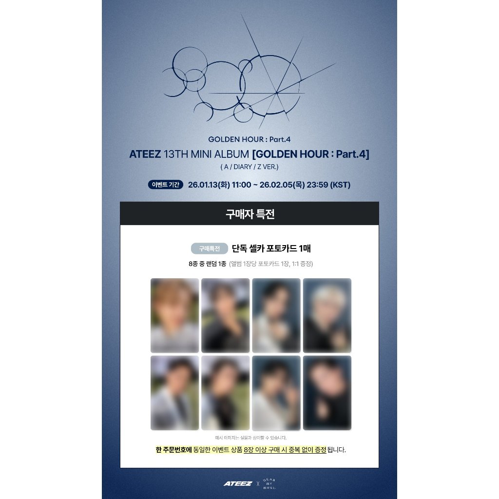 ATUALIZADO; 2026-01-13 DATA LIBERADA: FEB 6, 2026 💖ATEEZ 13o Mini Álbum HORA DOURADA: Part.4 💖POB ONLINE CARO MEU USO: CARO CARO CARO CARO CARO CARTÃO: FOTOCARD 1:1 Especificação de especificação MANGA FORA (3 VERSÕES / 1 CHÁ) FOTOBOOK (3 VERSÕES / 1 MAR) PORTA CONTEÚDO (3 VERSÕES / 1AA) - CARTÃO FOTOGRÁFICO A (3 VERSÕES / ALEATÓRIO 1 CHÁ (1 DE 8)) - CARTÃO FOTOGRÁFICO Z (3 VERSÕES / ALEATÓRIO 1 CHÁ (1 DE 8)) LIVRO DE ACORDO (3 VERSÕES / 1AA) ADESIVO (3 VERSÕES / 1ADESIVO) CARTÃO TEXTO E CARTÃO DE CAPA (3 VERSÕES / 1 CHÁ) PÔSTER DOBRADO (3 VERSÕES / 1 CHÁ) DESCANSO (3 VERSÕES / 1A) LIVRO - LIVRO DE DIARIA (1 VERSÃO / 1 EA) *MARCA DIARIA. Somente #SIXKSHOP