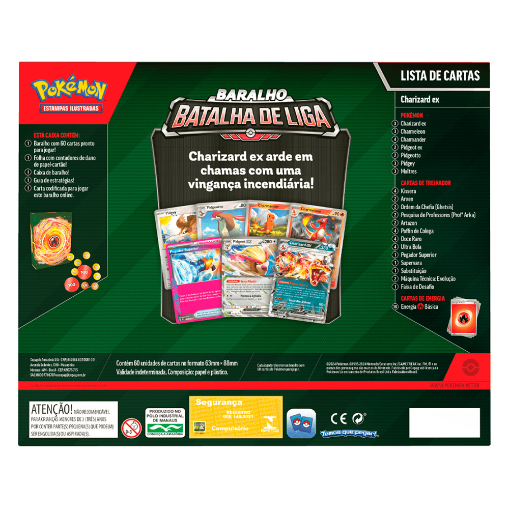 INFORMAÇÕES SOBRE O PRODUTO Charizard ex arde em chamas com uma vingança incendiária! Explore a potência do baralho Charizard ex e domine batalhas com este conjunto exclusivo de cartas Pokémon! Ideal para jogadores iniciantes e experientes, esta caixa inclui tudo o que você precisa para entrar no jogo e criar estratégias vencedoras. Com um baralho pronto para jogar, cartas poderosas como Charizard ex e Moltres, além de ferramentas essenciais para aprimorar suas partidas, este kit é perfeito para se destacar no mundo Pokémon. O Deck Pokémon Batalha de Liga: Charizard EX conta com as seguintes cartas: Pokémon 3x Charizard ex 3x Charmeleon 4x Charmander 2x Pidgeot ex 2x Pidgeotto 3x Pidgey 3x Moltres Cartas de Treinador 4x Kissera 2x Arven 2x Ordem da Chefia (Ghetsis) 2x Pesquisa de Professores (Prof Arka) 2x Artazon 4x Poffin de Colega 4x Doce Raro 4x Ultra Bola 1x Pegador Superior 1x Supervara 1x Substituição 2x Máquina Técnica: Evolução 1x Faixa de Desafio Cartas de Energia 10x Energia Básica: Fogo Dificuldade do Deck: - Nível 3 Conteúdo da Embalagem: - 1x Baralho com 60 cartas pronto para jogar. - 1x Folha com contadores de dano de papel-cartão. - 1x Caixa de baralho. - 1x Guia de estratégias. - 1x Carta codificada para jogar este baralho online. *Não indicado para menores de 3 anos. Imagens Meramente Ilustrativas. Todas as Informações divulgadas são de responsabilidade do Fabricante/Fornecedor. Verifique com os fabricantes do produto e de seus componentes eventuais limitações à utilização de todos os recursos e funcionalidades. *Garantia de 30 dias contra defeitos de fabricação não decorrentes de mal uso (mediante aprovação da fabricante).