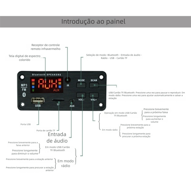 Funções principais: 1. Decodificação dupla compatível com formatos de música sem perdas, como MP3/WMA/WAV/FLAC/APE. 2. Compatível com Bluetooth versão 5.0. 3. Visor digital colorido. 4. Compatível com cartões MMC/SD/MMA e interface USB (pen drive). 5. Função de memória após desligamento. 6. Compatível com controle remoto infravermelho com alcance de até 10 metros. 7. Entrada de áudio externa (LINE IN). 8. Rádio FM com busca automática de frequência (87,5 MHz - 108,0 MHz). 9. Botões: Controle multidirecional com quatro botões: VOL-/SCAN/VOL+/MODE.