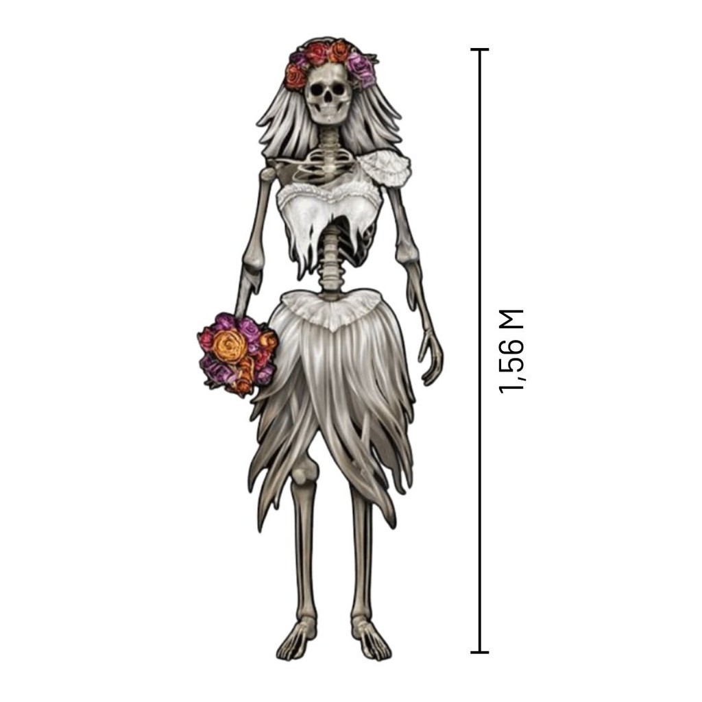 Decoração de esqueleto noiva para halloween - Decoração para pendurar. - Deixe sua festa de halloween ainda mais assustadora e divertida com essa decoração horripilante. Medidas aproximadas: 1,56m x 61cm; Composição: Papel cartão, ilhós, cordão de algodão e pigmentos atóxicos ATENÇÃO: - Quantidade no título do anúncio. - Confira o prazo de envio no ato da compra. - Caso ocorra algum problema com a compra entre em contato com nossos canais de comunicação.