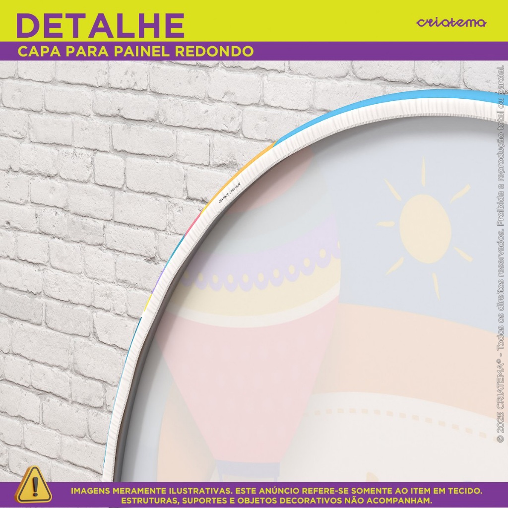 Agora sua decoração de Dia das Crianças vai transmitir ainda mais alegria e diversão! Capas e painéis sublimados em tecido com estampas encantadoras, ideais para valorizar esse momento especial com cor, magia e muita criatividade! Impressão de alta qualidade, cores vibrantes e acabamento impecável. Práticos, fáceis de usar e perfeitos para tornar sua festa ainda mais linda, divertida e inesquecível! *** ATENÇÃO: NÃO FAZEMOS AJUSTES DE MEDIDA OU ARTE NAS CAPAS E PAINÉIS DESTE ANÚNCIO. VERIFIQUE AS MEDIDAS ANTES DE FINALIZAR A COMPRA *** >>>ATENÇÃO<<< NÃO ACOMPANHA ESTRUTURA/SUPORTE, VENDEMOS SOMENTE AS CAPAS/PAINÉIS EM TECIDO!!! ---------------------------------------------------------------------------------- > MEDIDA DO PAINEL REDONDO EM TECIDO: - Tamanho Único - Utilização em estruturas circulares entre 1,20 até 1,50 de diâmetro. + Elástico cuidadosamente costurado ao redor do painel redondo. ---------------------------------------------------------------------------------- > MEDIDAS DA CAPA DE TRIO PARA CILINDRO: TAMANHO P: (A) Altura: 48cm // (D) Diâmetro: 39cm // (C) Circunferência: 122cm TAMANHO M: (A) Altura: 60cm // (D) Diâmetro: 45cm // (C) Circunferência: 141cm TAMANHO G: (A) Altura: 80cm // (D) Diâmetro: 51cm // (C) Circunferência: 160cm + Elástico cuidadosamente costurado na base dos cilindros. ---------------------------------------------------------------------------------- > MEDIDA DA CAPA DE MESA MONTADA: - Tamanho Único - 0,70x1,40 com corte laser, evitando que seu produto desfie! - DICA DE USO: • Decorações de mesa veste fácil • Utilizar duas mesas de plástico tamanho tradicional de 70cmx70cm lado a lado, proporcionando uma cobertura elegante e ajustada em um instante. ---------------------------------------------------------------------------------- > MEDIDA DA CAPA DE PORTA: - Tamanho Único - 0,85x2,10 com corte laser, evitando que seu produto desfie! - DICA DE USO: • Recomendamos o uso em portas na medida de 0,80cm de largura por 2,10cm de altura. + Acabamento à laser nas laterais. + Acabamento em elástico facilitando o encaixe da capa de porta ---------------------------------------------------------------------------------- > MEDIDA DO PAINEL ROMANO: - Tamanho Único - 1,00x2,00 com acabamento em elástico ao redor de todo painel. + Acabamento em elástico para fixação do painel romano. ---------------------------------------------------------------------------------- > MEDIDA DO PAINEL HORIZONTAL: - 2,00m de largura x 1,50m altura ---------------------------------------------------------------------------------- Graças às Capas e Painéis de Festa em Tecido da CRIATEMA, sua decoração ganha cor, impacto e magia, tornando cada detalhe ainda mais especial e cheio de encanto! DETALHES DAS CAPAS E PAINÉIS EM TECIDO: + Tecido Malha New (Que estica e não amassa). + Tecido Leve com ótimo caimento + Gramatura: 140g/m de excelente qualidade. + Composição do Tecido: 95% Poliéster e 5% de Elastano. PRODUÇÃO E ENVIO: - TODOS OS PEDIDOS ACOMPANHAM NOTA FISCAL. - O envio é feito em embalagem individual e com todo carinho. - Os prazos para entrega variam conforme o seu CEP, não nos responsabilizamos pelos prazos dados pela Plataforma. *** Tem alguma dúvida antes de finalizar sua compra? Envie uma mensagem para nós que ajudaremos você! Temos vários anos de experiência no mercado em itens sublimados. ***