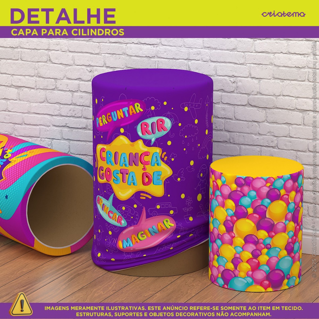 Agora sua decoração de Dia das Crianças vai transmitir ainda mais alegria e diversão! Capas e painéis sublimados em tecido com estampas encantadoras, ideais para valorizar esse momento especial com cor, magia e muita criatividade! Impressão de alta qualidade, cores vibrantes e acabamento impecável. Práticos, fáceis de usar e perfeitos para tornar sua festa ainda mais linda, divertida e inesquecível! *** ATENÇÃO: NÃO FAZEMOS AJUSTES DE MEDIDA OU ARTE NAS CAPAS E PAINÉIS DESTE ANÚNCIO. VERIFIQUE AS MEDIDAS ANTES DE FINALIZAR A COMPRA *** >>>ATENÇÃO<<< NÃO ACOMPANHA ESTRUTURA/SUPORTE, VENDEMOS SOMENTE AS CAPAS/PAINÉIS EM TECIDO!!! ---------------------------------------------------------------------------------- > MEDIDA DO PAINEL REDONDO EM TECIDO: - Tamanho Único - Utilização em estruturas circulares entre 1,20 até 1,50 de diâmetro. + Elástico cuidadosamente costurado redor do painel redondo. ---------------------------------------------------------------------------------- > MEDIDAS DA CAPA DE TRIO PARA CILINDRO: TAMANHO P: (A) Altura: 48cm // (D) Diâmetro: 39cm // (C) Circunferência: 122cm TAMANHO M: (A) Altura: 60cm // (D) Diâmetro: 45cm // (C) Circunferência: 141cm TAMANHO G: (A) Altura: 80cm // (D) Diâmetro: 51cm // (C) Circunferência: 160cm + Elástico cuidadosamente costurado na base dos cilindros. ---------------------------------------------------------------------------------- > MEDIDA DA CAPA DE MESA MONTADA: - Tamanho Único - 0,70x1,40 com corte laser, evitando que seu produto desfie! - DICA DE USO: • Decorações de mesa veste fácil • Utilizar duas mesas de plástico tamanho tradicional de 70cmx70cm lado a lado, proporcionando uma cobertura elegante e ajustada em um instante. ---------------------------------------------------------------------------------- > MEDIDA DO PAINEL RETANGULAR INTERATIVO: - Tamanho Único - 1,50m de largura por 2,20m de altura + Acabamento passa varão para fixação do painel vertical retangular. ---------------------------------------------------------------------------------- > MEDIDA DO PAINEL HORIZONTAL: (Confira na opção tamanho qual medida é o produto) - 1,50m de largura x 1,00m altura - 2,00m de largura x 1,50m altura ---------------------------------------------------------------------------------- Graças às Capas e Painéis de Festa em Tecido da CRIATEMA, sua decoração ganha cor, impacto e magia, tornando cada detalhe ainda mais especial e cheio de encanto! DETALHES DAS CAPAS E PAINÉIS EM TECIDO: + Tecido Malha New (Que estica e não amassa). + Tecido Leve com ótimo caimento + Gramatura: 140g/m de excelente qualidade. + Composição do Tecido: 95% Poliéster e 5% de Elastano. PRODUÇÃO E ENVIO: - TODOS OS PEDIDOS ACOMPANHAM NOTA FISCAL. - O envio é feito em embalagem individual e com todo carinho. - Os prazos para entrega variam conforme o seu CEP, não nos responsabilizamos pelos prazos dados pela Plataforma. *** Tem alguma dúvida antes de finalizar sua compra? Envie uma mensagem para nós que ajudaremos você! Temos vários anos de experiência no mercado em itens sublimados. ***