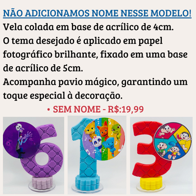 Velas de biscuit para aniversário: Incluso: 1 Vela de Biscuit. 1 Pavio Magico para acender e cantar parabéns. Tamanho da base acrilica: Sem nome - 4 centimetros. Altura da vela: As velas variam de tamanho conforme os modelos, altura minima de 9 centimetros. Atenção: A posição dos apliques pode mudar de acordo com o número. Pode haver uma pequena variação nas cores dos produtos em relação às imagens exibidas no site, nada que interfira na qualidade do produto!