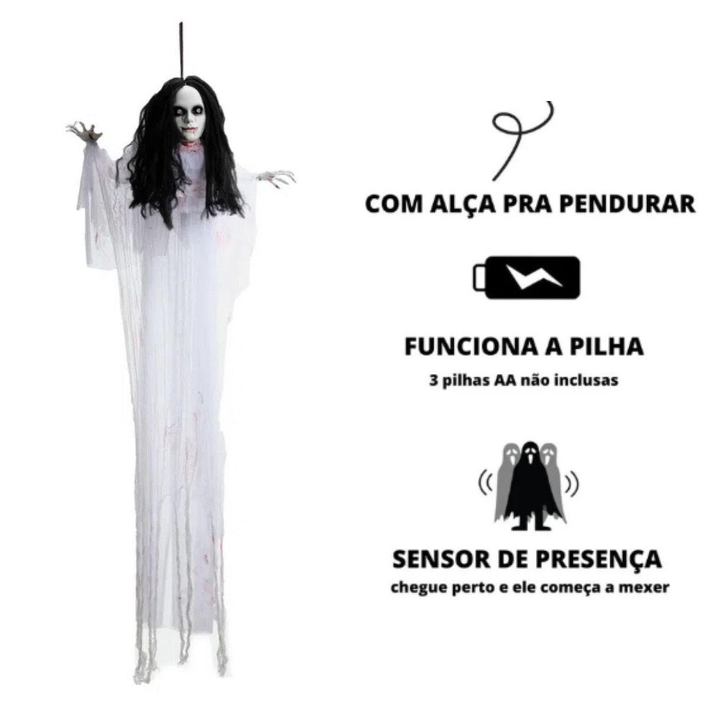 Itens inclusos: 01 Decoração Boneca Assustadora Com Luz, Som e Sensor Medidas Aproximadas: 130 cm Altura Especificações Técnicas Material: Plástico e Tecido Produto: Produto novo, na embalagem. Cor: Branco Produto Importado e a pronta entrega! Traga o terror icônico do filme "O Chamado" para a sua festa de Halloween com nossa Boneca Eletrônica inspirada na Samara. Pendure-a onde quiser e deixe o horror começar. Esta boneca tem sensor de movimento, ela acende luzes sinistras e emite o som perturbador que todos conhecemos e tememos. Com seu som característico, esta boneca eletrônica vai arrepiar a espinha de qualquer um que ouse se aproximar. Feita de plástico resistente e tecido, esta decoração é durável e realista, garantindo que seu Halloween seja memorável por anos. Use 3 pilhas AAA (não inclusas) para dar vida a Samara. Pendure-a em portas, janelas ou onde desejar e prepare-se para a reação assustada dos seus convidados. Confira! Tema Dia Das Bruxas Boneca Eletrônica Utiliza 3 Pilhas AAA Não Inclusas Com Som Luz e Sensor de Movimento Material Plástico Resistente