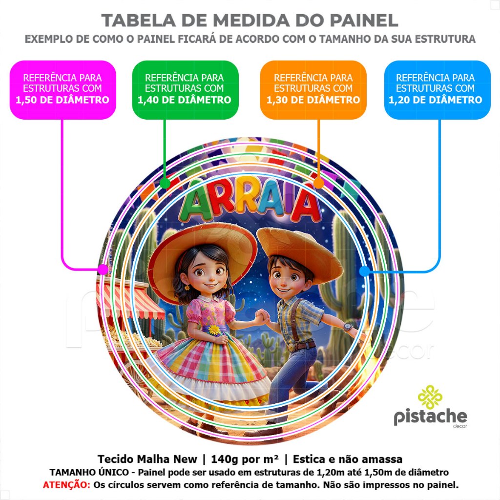 *** ATENÇÃO: NÃO FAZEMOS AJUSTES DE MEDIDA OU ARTE NAS CAPAS DE CILINDRO DESTE ANÚNCIO. VERIFIQUE AS MEDIDAS ANTES DE FINALIZAR A COMPRA *** >>>ATENÇÃO<<< NÃO ACOMPANHA ESTRUTURA/SUPORTE, VENDEMOS SOMENTE AS CAPAS EM TECIDO, SISTEMA VESTE FÁCIL!!! ----------------------------------------------------------------------------------------------------------------------- >>> MEDIDA DO PAINEL REDONDO EM TECIDO: - Tamanho Único - Utilização em estruturas circulares entre 1,20 até 1,50 de diâmetro. + Elástico cuidadosamente costurado redor do painel redondo. ---------------------------------------------------------------------------------- >>> MEDIDAS DO TRIO DE CAPA PARA CILINDRO: TAMANHO P: (A) Altura: 48cm // (D) Diâmetro: 39cm // (C) Circunferência: 122cm TAMANHO M: (A) Altura: 60cm // (D) Diâmetro: 45cm // (C) Circunferência: 141cm TAMANHO G: (A) Altura: 80cm // (D) Diâmetro: 51cm // (C) Circunferência: 160cm + Elástico cuidadosamente costurado na base dos cilindros. ---------------------------------------------------------------------------------- >>> MEDIDA DA CAPA DE MESA MONTADA: - Tamanho Único - 0,70x1,40 com corte laser, evitando que seu produto desfie! - DICA DE USO: • Decorações de mesa veste fácil • Utilizar duas mesas de plástico tamanho tradicional de 70cmx70cm lado a lado, proporcionando uma cobertura elegante e ajustada em um instante. ---------------------------------------------------------------------------------- >>> MEDIDA DO PAINEL ROMANO: - Tamanho Único - 1,00x2,00 com acabamento em elástico ao redor de todo painel. + Acabamento em elástico para fixação do painel romano. ---------------------------------------------------------------------------------- >>> MEDIDA DO PAINEL RETANGULAR 1,50x2,30: - Tamanho Único - 1,50m de largura por 2,20m de altura + Acabamento passa varão para fixação do painel vertical retangular. ---------------------------------------------------------------------------------- >>> MEDIDA DA CAPA DE PORTA: - Tamanho Único - 0,85x2,10 com corte laser, evitando que seu produto desfie! - DICA DE USO: • Recomendamos o uso em portas na medida de 0,80cm de largura por 2,10cm de altura. + Acabamento à laser nas laterais. + Acabamento em elástico facilitando o encaixe da capa de porta ---------------------------------------------------------------------------------- Agora sua festa está completa!!! Graças as Capas e Painéis de Festa em Tecido da Pistache Decor!!! DETALHES DAS CAPAS E PAINÉIS EM TECIDO: + Tecido Malha New (Que estica e não amassa). + Tecido Leve com ótimo caimento + Gramatura: 140g/m de excelente qualidade. + Composição do Tecido: 95% Poliéster e 5% de Elastano. PRODUÇÃO E ENVIO: - TODOS OS PEDIDOS ACOMPANHAM NOTA FISCAL. - O trio de capas é enviado em até 1 DIA ÚTIL após pagamento aprovado. - Possui garantia contra defeito de fabricação. - O envio é feito em embalagem individual e com todo carinho. - Os prazos para entrega variam de acordo com o seu CEP, não nos responsabilizamos pelos prazos dados pela Plataforma. *** Tem alguma dúvida antes de finalizar sua compra? Envie uma mensagem para nós que ajudaremos você! Temos vários anos de experiência no mercado em itens sublimados. ***
