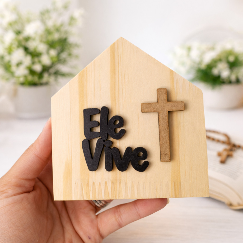 🏡✝️ Casinha Decorativa “Ele Vive” — perfeita para trazer significado e beleza à sua mesa posta ou decoração do ambiente. Uma peça delicada, com composição em madeira Pinus e detalhes em MDF, ideal para decorar com fé e estilo. ✅ Destaques • Base em madeira Pinus (natural e elegante) • Escrita “Ele Vive” em MDF laminado preto • Cruz em MDF cru, criando contraste sofisticado • Ideal para mesa posta, aparadores, nichos e decoração cristã 📏 Medidas • 10 x 10 cm 🧱 Materiais • Pinus natural • MDF laminado preto (escrita) • MDF cru (cruz) 📦 Informações da Embalagem • Tamanho da embalagem: 35 x 25 cm • Peso aproximado: 200 g 📌 Observações Importantes • A madeira pode apresentar variações naturais de tom e veios. • Uso decorativo (não é brinquedo). • Limpeza: pano seco ou levemente umedecido, sem produtos abrasivos.