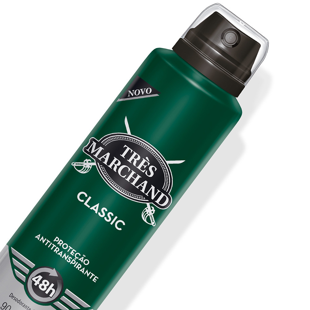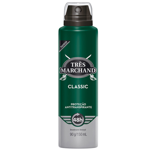 O desodorante aerossol antitranspirante três marchand clássica oferece 48 horas de proteção antitranspirante comprovada. A renomada fragrância da marca três marchand proporciona uma sensação de bem-estar duradouro.