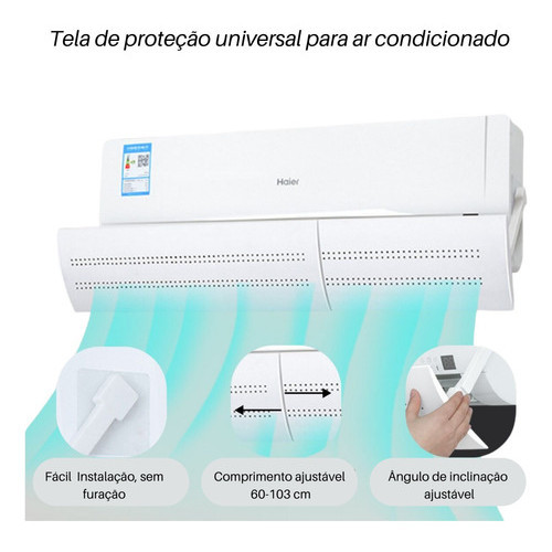 Os Defletores de Ar são projetados para direcionar o vento gelado, deixando o ar condicionado fluir para cima. Isso evita que o vento toque diretamente as partes mais sensíveis da pessoa, como o rosto. Com design moderno e discreto, possui pequenos orifícios que ajudam a distribuir o ar por todo o ambiente. ATENÇÃO: Esse produto NÃO é um Ar condicionado ! -O comprimento do defletor pode ser ajustado atendendo praticamente a quase todos os ar condicionados SPLIT do mercado. Além disso, é possível ajustar o ângulo do defletor em 3 diferentes posições. -A instalação é simples! Pode ser feita sozinha em poucos minutos e não exige furos e nem a presença de um profissional. O produto inclui um manual de instrução com um link de um vídeo que auxilia como instalar. Após instalado, a remoção pode ser feita apenas removendo a haste do adesivo. CARACTERÍSTICAS - Não necessita furar a parede ou de técnico para montagem e instalação; - Leve e fácil de limpar; - Universal para todos os modelos Slipt - Possui 3 regulagens de ângulos para melhor direcionamento do ar; CARACTERÍSTICAS TÉCNICAS: Tipo de Ar Condicionado: Modelo Split de 60cm expansível até 103cm de comprimento. Material: PVC PACOTE INCLUI: Defletor de ar condicionado; Hastes e adesivos; Manual de instalação.