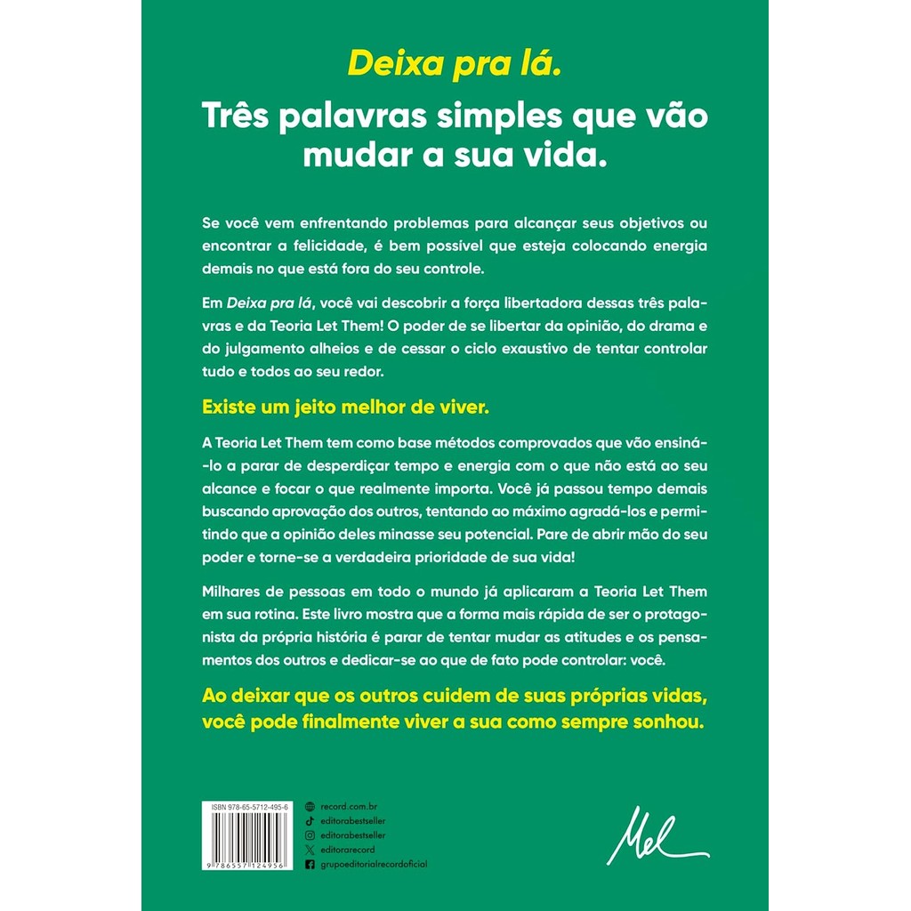 Deixe de lado o que não pode controlar e concentre-se no que está ao seu alcance com o best-seller que já mudou a vida de milhões de pessoas em todo o mundo e se tornou o maior fenômeno editorial do ano. Se você já se sentiu perdido, sobrecarregado ou frustrado com o rumo da sua vida, a raiz do problema pode ser mais simples do que parece: o poder que você tem dado às atitudes e opiniões dos outros. O colega de trabalho que está sempre reclamando, aquele familiar que acha que sabe o que é melhor para a sua vida, aquela amizade que se afastou sem motivo aparente... Se está cansado de viver em função de críticas, expectativas e dramas alheios, está na hora de experimentar uma nova forma de enxergar a vida ― e tudo começa com três palavras: Deixa pra lá! Foi assim que Mel Robbins ― palestrante, especialista em mudança comportamental e autora best-seller ― mudou a maneira como se relacionava com o mundo e criou a poderosa Teoria Let Them. Neste livro, ela mostra como parar de desperdiçar energia com o que está fora do seu controle e redirecionar o foco para o que realmente importa: você. A sua felicidade. Os seus planos. O seu bem-estar. As pessoas sempre nos mostram quem realmente são por meio de suas atitudes. E quando permitimos que o façam, revelamos nossa verdadeira força: a capacidade de escolher o que faremos com isso. Com abordagem prática e linguagem acessível, Deixa pra lá:A Teoria Let Them se tornou um best-seller instantâneo e já mudou a vida de milhões de pessoas ao redor do mundo! Agora é a sua vez de descobrir o poder transformador dos lemas “deixa pra lá” e “deixa comigo”, aplicando-os em oito áreas essenciais da sua vida. Com o apoio de histórias reais, pesquisas e contribuições de especialistas em psicologia, neurociência e relacionamentos Mel Robbins convida você a não ligar tanto para o que os outros pensam e a se concentrar no que realmente depende de você. É hora de construir uma vida em que você seja a prioridade, e tudo começa com três palavras: Deixa pra lá!