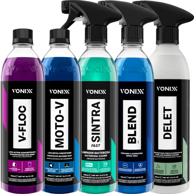 KIT CONTÉM: V-FLOC 500ML MOTO-V 500ML SINTRA FAST 500ML BLEND SPRAY 500ML DELET 500ML ------------------------------------------------------------ SINTRA FAST 500ML - LIMPEZA INTERNA DE VEÍCULOS DESCRIÇÃO: Sintra Fast é um multilimpador flotador universal, bactericida e germicida de pH balanceado, indicado para limpeza de painéis, laterais e cantos de portas, bancadas de couro, carpetes e estofados. MODO DE USO: Em painéis, laterais, cantos de portas e bancos de couro: 1. Pulverizar o produto na superfície a ser limpa e desinfetada 2. Utilizar pincel, escova macia ou aplicador de espuma e realizar movimentos circulares até observar o desprendimento total da sujeira 3. Remover o excesso com auxílio de toalha de microfibra úmida. Secar em seguida com uma toalha de microfibra seca ------------------------------------------------------------ V-FLOC 500ML - LAVA AUTOS SUPER CONCENTRADO DESCRIÇÃO: V-Floc é um lava autos de alta performance e de pH neutro. Sua fórmula contém agentes condicionadores e tensoativos especiais que proporcionam uma lavagem suave e eficiente. MODO DE USO: 1. Realizar a pré-lavagem do veículo para retirada do excesso de sujeira 2. Diluir aproximadamente 10ml de V-FLOC em 4 litros de água; Recomendamos ajustar a quantidade de produto de acordo com o nível de sujeira 3. Iniciar a lavagem com o auxílio de Luva de Microfibra, sempre começando pela parte superior do veículo 4. Mergulhar a luva na solução e esfregar suavemente, até completar todo o veículo 5. Enxaguar em seguida até a retirada de todo o produto 6. Recomendamos o uso da Toalha de Secagem para finalizar ------------------------------------------------------------ BLEND CERAMIC SPRAY WAX 500ML - CERA LÍQUIDA COM SIO2 E CARNAÚBA DESCRIÇÃO: Blend Ceramic & Carnaúba Spray Wax é uma cera híbrida, composta por SiO2 e pela mais pura carnaúba tipo 1 e que protege a superfície veicular por até quatro meses. O produto promove a resistência cerâmica, brilho quente da carnaúba e hidrorrepelência. DURABILIDADE: Até quatro meses de durabilidade MODO DE USAR: 1. Agite bem o produto antes de usar 2. Após lavar o veículo, pulverize uma pequena quantidade do produto na pintura. Mantenha uma distancia de 20 cm em uma área não superior à 60 cm x 60 cm 3. Sem deixar secar, realize o acabamento utilizando toalha de microfibra limpa e seca, até obter o brilho desejado 4. Continue fazendo o processo até a conclusão total do veículo Obs: Em caso de manchas, aplicar novamente o produto. ------------------------------------------------------------ DELET 500ML - LIMPADOR PARA PNEUS E BORRACHAS DESCRIÇÃO: É um limpador de alta performance, formulado exclusivamente para remover sujidade severa em pneus e borrachas, garantindo total limpeza devolvendo originalidade e sem deixar aspecto acizentado. Essa limpeza ajudará a melhorar a performance dos produtos para condicionar os pneus. MODO DE USO: 1. Com o pneu ainda seco, pulverizar a espuma do produto em todo pneu 2. Deixar o produto agir de 30 a 60 segundos, ou até observar uma mudança de coloração da espuma de branco para cinza, marrom ou preto 3. Fazer a escovação por completo utilizando uma escova para limpeza de pneus 4. Fazer um enxágue com jato de água ------------------------------------------------------------ MOTO-V 500ML - LAVA MOTOS CONCENTRADO DESCRIÇÃO: Moto-V é um lava-motos, desenvolvido para limpeza de alta eficiência. Sua formulação equilibrada permite uso, sem agredir, em todas as partes da motocicleta, seja motor, pintura, metais ou plásticos. As possíveis diluições do produto proporcionam ao mesmo a remoção dos mais diversos tipos de sujeira, como barro, lama, graxa e óleo. DILUIÇÃO: Remoção de graxa e óleo – Até 1:10 Lavagem diária da pintura – Até 1:200 Remoção de barro e lama – Até 1:50 MODO USO: 1. Diluir o produto de acordo com a sujeira 2. Realizar pré-lavagem a fim de remover parte da sujeira 3. Em seguida, usar pincel, luva de microfibra ou escovas a depender da superfície e esfregar até o total desprendimento da sujeira 4. Por último, realizar o enxágue com um jato d’água