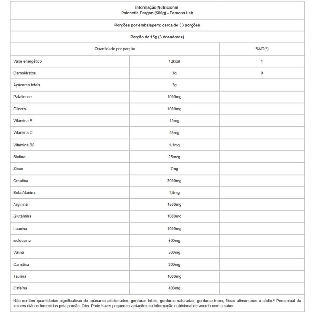 Pré-Treino Psichotic Dragon Pote 500g Demons Lab Sobre o produto: Psichotic Dragon da Demons Lab é um pré-treino de alta performance formulado para aumentar energia, resistência e foco nos treinos mais intensos. Sua composição reúne ingredientes estratégicos como creatina, beta-alanina, BCAAs, taurina e cafeína, proporcionando suporte para força, recuperação e disposição. Combinando Palatinose® e glicerol, também auxilia na hidratação muscular e liberação gradual de energia, reduzindo fadiga e melhorando a performance. Como usar: Diluir 15g (3 dosadores) em aproximadamente 200ml de água e consumir 30 minutos antes do treino. Não exceder a dose recomendada. Benefícios: - Aumento de força e resistência, com creatina e beta-alanina para potencializar o desempenho muscular - Mais energia e foco, graças à cafeína e à taurina, que auxiliam na disposição e concentração - Hidratação muscular aprimorada, com glicerol para melhor absorção de água e redução da fadiga - Recuperação otimizada, com BCAAs e glutamina para minimizar o catabolismo muscular - Suporte nutricional completo, com vitaminas e minerais essenciais para o metabolismo energético Alergênicos: Não contém glúten. Ingredientes: Creatina monohidratada, isomaltulose, beta alanina, L-arginina, L-glutamina, L-leucina, taurina, L-isoleucina, L-valina, cafeína/1,3,7-trimetilxantina, L-carnitina, ácido ascórbico, DL-alfa-tocoferol, cloridrato de piridoxina, bisglicinato de zinco, D-biotina, agente de massa glicerol, aroma sintético idêntico ao natural de frutas vermelhas, edulcorante sucralose e corante vermelho amaranto. NÃO CONTÉM GLÚTEN. Advertências: Este produto contém cafeína (400mg por porção) e não deve ser consumido por crianças, gestantes, nutrizes ou indivíduos sensíveis à substância. O uso deve ser orientado por médico ou nutricionista. Não exceder a dose recomendada. Conclusão: Psichotic Dragon da Demons Lab é um pré-treino completo para quem busca mais força, resistência e foco nos treinos. Com uma combinação estratégica de ingredientes, ele ajuda a maximizar a performance, retardar a fadiga e melhorar a recuperação muscular, tornando-se um aliado essencial para treinos de alto nível.