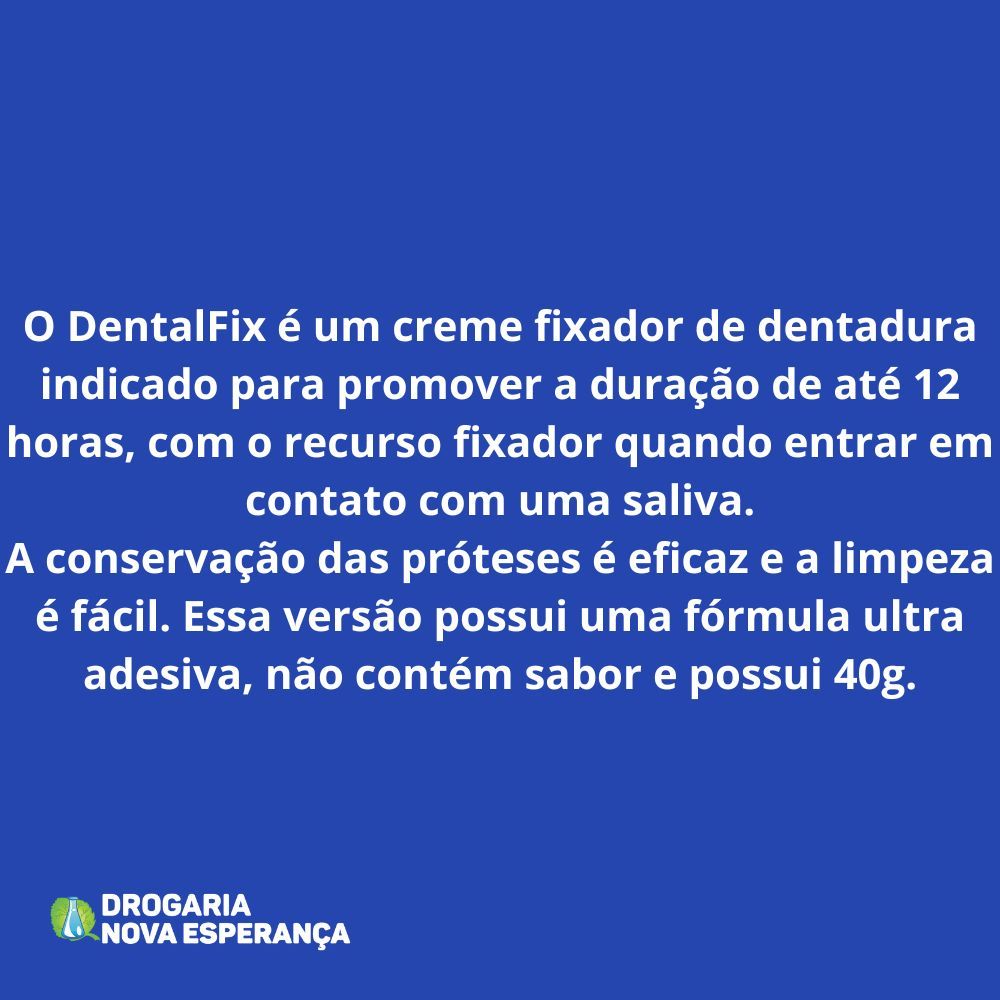 DentalFix é um creme fixador de dentadura indicado para: - Promover duração de até 12 horas, com característica fixadora quando entram em contato com a saliva.