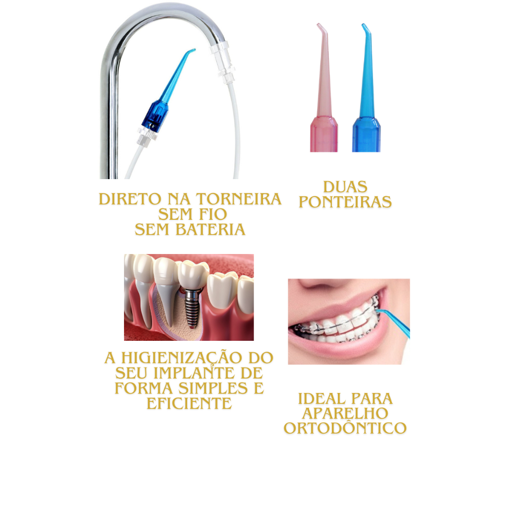 Dentvap Clean é um aparelho de uso doméstico para limpeza bucal com jato de água, desenvolvido para auxiliar na remoção de resíduos alimentares em áreas de difícil alcance durante a rotina diária de limpeza da boca. Fabricado em plástico ABS, o Dentvap Clean funciona diretamente conectado à torneira, utilizando apenas a pressão da água, sem necessidade de energia elétrica, bateria ou reservatório. O jato de água pode ser direcionado para regiões onde a escovação convencional e o fio dental apresentam maior dificuldade de alcance, contribuindo para uma sensação de limpeza e frescor após o uso. É indicado para uso diário como complemento à rotina de limpeza bucal, inclusive em aparelhos ortodônticos e próteses, conforme orientação de uso do fabricante. DENTVAP CLEAN conta com seis adaptadores (um deles vai se adaptar a sua torneira) e um arejador para substituir a ponta arejadora de sua torneira, uma mangueira com conectores de engate rápido (todos na cor Branca) e duas ponteiras de cores diferenciadas. Uma vez instalado o DENTVAP CLEAN na ponta da sua torneira, basta conectar a mangueira com apenas 1/4 de volta. Sem necessidade de carregar bateria Sem necessidade encher reservatório de água. Sem volume exagerado em cima da pia Sem necessidade de assistência técnica Sem necessidade de energia elétrica Não precisa nem apertar botão O Dentvap é de uso simples e eficiente! A maior eficiência deste aparelho depende da pressão da água na torneira onde será instalado, pois não apresenta nenhum tipo de motor ou equipamento para aumentar a pressão já existente Torneiras que não possuam arejadores rosqueáveis em sua ponta, não são indicadas para instalação do aparelho.