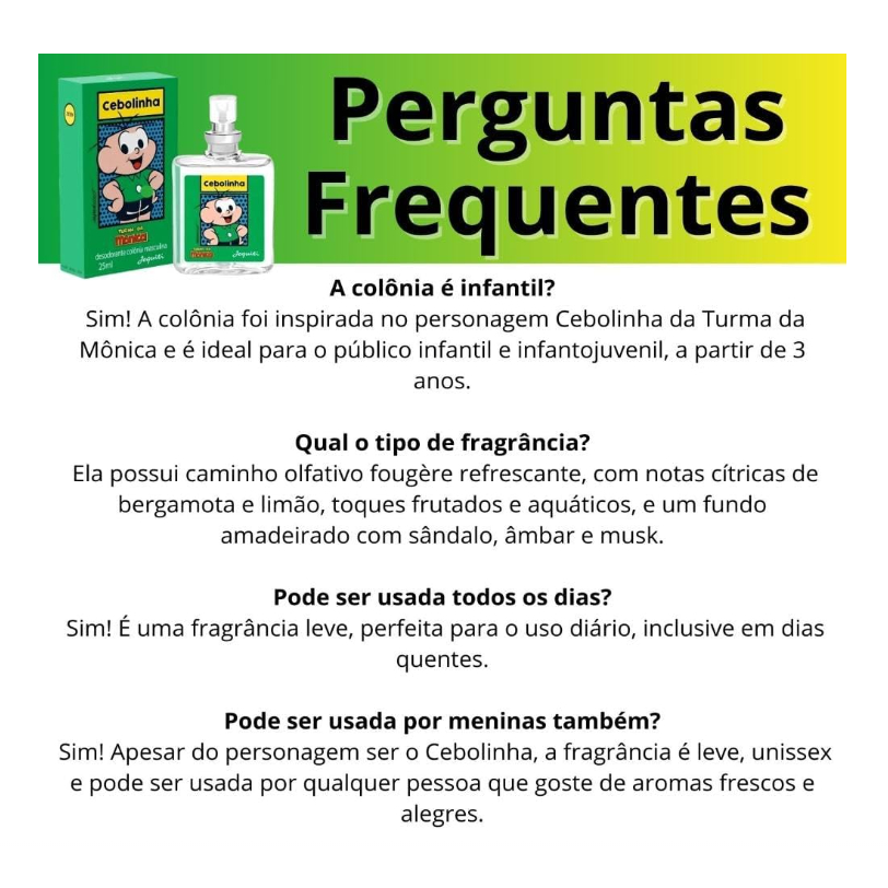 Descubra a Deo Colônia Cebolinha 25ml da Jequiti, uma fragrância refrescante e divertida que traz a alegria da Turma da Mônica para o seu dia a dia. Com uma embalagem prática de 25ml, é perfeita para levar na bolsa e usar a qualquer momento. Este perfume, que pertence à linha Turma da Mônica, é ideal para meninos e proporciona uma experiência olfativa única com seu aroma fougère refrescante. Lançado em 2024, este Eau de Cologne é uma escolha nova e vibrante para os pequenos. Além disso, é um produto novo, que garante qualidade e frescor, tornando-se uma excelente opção para presentear ou para uso pessoal. Aproveite a leveza e o encanto da infância com a Deo Colônia Cebolinha!