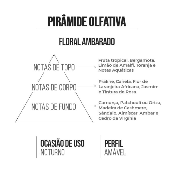 Se você valoriza o luxo e a modernidade, este é o perfume ideal para você. Esta fragrância floral ambarada personifica o estilo da mulher segura e compreensiva, que sabe o que quer e como alcançá-lo. Com uma combinação exuberante de notas florais e ambaradas, este perfume emana sofisticação e elegância. As notas florais adicionam uma delicadeza refinada, enquanto as notas ambaradas conferem profundidade e calor à fragrância. Use este perfume para expressar sua personalidade única e sua confiança inabalável. Deixe sua presença ser marcada pelo aroma envolvente e sedutor desta fragrância, enquanto você enfrenta cada desafio com graça e determinação. Esteja pronta para atrair olhares admirados e deixar uma impressão duradoura com este perfume que é verdadeiramente luxuoso e moderno. Família olfativa: Floral Ambarado. Notas Olfativas: • Notas de Topo: Fruta tropical, Bergamota, Limão de Amalfi, Toranja e Notas Aquáticas. • Notas de Corpo: Pralinê, Canela, Flor de Laranjeira Africana, Jasmim e Tintura de Rosa. • Notas de Fundo: Camurça, Patchouli ou Oriza, Madeira de Cashmere, Sândalo, Almíscar, Âmbar e Cedro da Virgínia. Indicações: Para usar: Dia e Noite Ocasião: Romance Perfil: Sedutora e Confiante Inspiração - CH Feminino