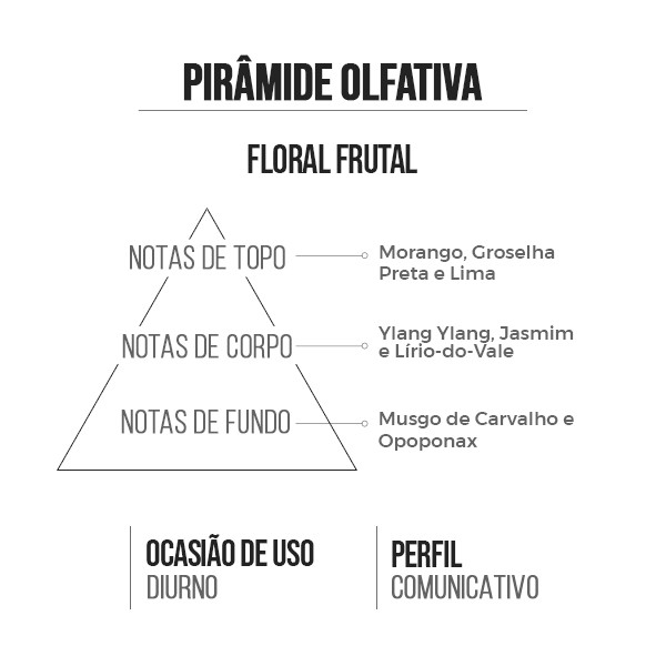 O perfume que você descreve é verdadeiramente majestoso, combinando notas frutadas e florais para criar uma fragrância que evoca a elegância e a sofisticação de uma verdadeira rainha. Com notas de morango, ylang ylang, jasmim e groselha preta, essa composição olfativa promete uma experiência sensorial única e envolvente. O aroma do morango adiciona uma doçura suculenta à fragrância, enquanto o ylang ylang traz uma sensualidade exótica e floral. O jasmim, conhecido como a ""flor da rainha"", acrescenta uma nota de luxo e feminilidade à mistura, enquanto a groselha preta contribui com um toque vibrante e frutado. Ao borrifar esse perfume, você será transportada para um reino de luxo e requinte, onde cada nota dança harmoniosamente para criar uma experiência olfativa verdadeiramente memorável. Sinta-se como uma rainha, cercada por uma aura de glamour e poder, enquanto desfruta dessa fragrância floral frutal excepcional. ✅ Referência olfativa: Rouge Royal. ✅ Família Olfativa: Floral Frutal. ✅ Notas olfativas: • Notas de Topo: Morango, Groselha Preta e Lima. • Notas de Corpo: Ylang Ylang, Jasmim e Lírio-do-Vale. • Notas de Fundo: Musgo de Carvalho e Opoponax. Indicações: ✔️ Para usar: Dia. ✔️ Ocasião: Elegância. ✔️ Perfil: Comunicativa. ✔️ Estação: Primavera.