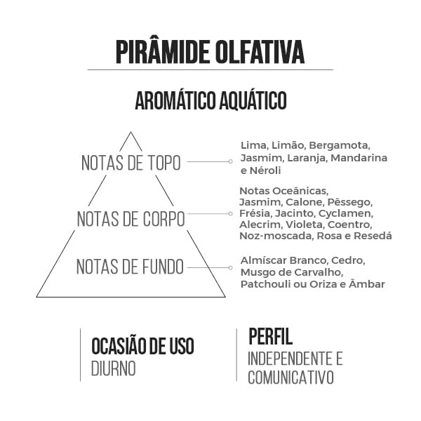 Apresento-lhe um perfume aromático aquático que evoca o frescor do Mediterrâneo, impulsionando o homem a realizar seus desejos mais instintivos e conectando-o com suas raízes na natureza. Com notas oceânicas, de alecrim, bergamota, musgo do carvalho e noz-moscada, esta fragrância é uma celebração da vitalidade e da beleza natural. Cada borrifada é como um mergulho revigorante no mar azul-turquesa, despertando seus sentidos e inspirando você a seguir seus instintos mais profundos. Use este perfume para se reconectar com a natureza e suas origens, deixando sua presença ser marcada pela frescura e pela energia do Mediterrâneo. Esteja preparado para explorar novos horizontes e realizar seus desejos mais autênticos com este perfume aromático aquático ao seu lado. Família olfativa: Aromático Aquático. Notas Olfativas: • Notas de Topo: Lima, Limão, Bergamota, Jasmim, Laranja, Mandarina e Néroli. • Notas de Corpo: Notas oceâncias, Jasmim, Calone, Pêssego, Frésia, Jacinto, Cyclamen, Alecrim, Violeta, Coentro, Noz-moscada, Rosa e Resedá.. • Notas de Fundo: Almiscar branco, Cedro, Musgo de carvalho, Patchoulli ou Oriza ou Âmbar. Indicações: Para usar: Dia ou Noite Ocasião: Sedução, Passeio ou Social Perfil: Comunicativo e Confiante Inspiração - Acqua di Gio