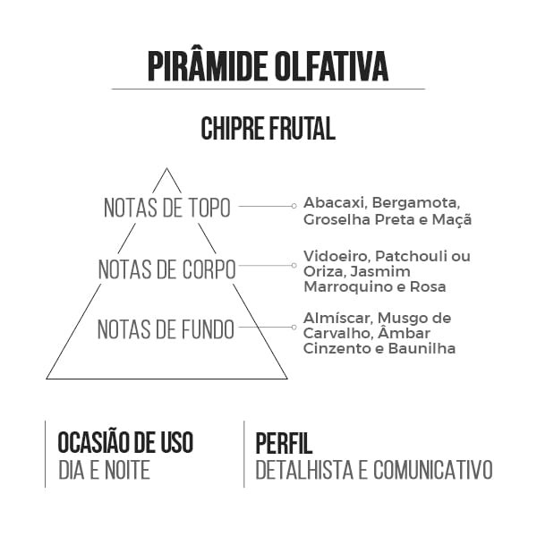 Deixe-me encorajar você a deixar seu entusiasmo falar mais alto e a ter fascínio por quem você é. Apresentando o perfume Chipre Frutal Trust, uma ode ao homem comunicativo e expansivo. Este aroma vibrante e envolvente é uma celebração da personalidade ousada e carismática. Com uma mistura única de notas chipre e frutadas, Trust é mais do que um perfume - é uma expressão da sua autenticidade e confiança. Deixe-se envolver por esta fragrância cativante e permita que ela o inspire a comunicar sua verdadeira essência ao mundo. Confie em si mesmo, confie em Trust. Família Olfativa: Chypre Frutal Notas Olfativas: • Notas de Topo: Abacaxi, Bergamota, Groselha Preta e Maçã. • Notas de Corpo: Vidoeiro, Patchouli ou Oriza, Jasmim Marroquino e Rosa. • Notas de Fundo: Almíscar, Musgo de Carvalho, Âmbar Cinzento e Baunilha. Indicações: Para usar: Dia e Noite Ocasião: Sedução, Passeio ou Social Perfil: Comunicativo Inspiração - Creed