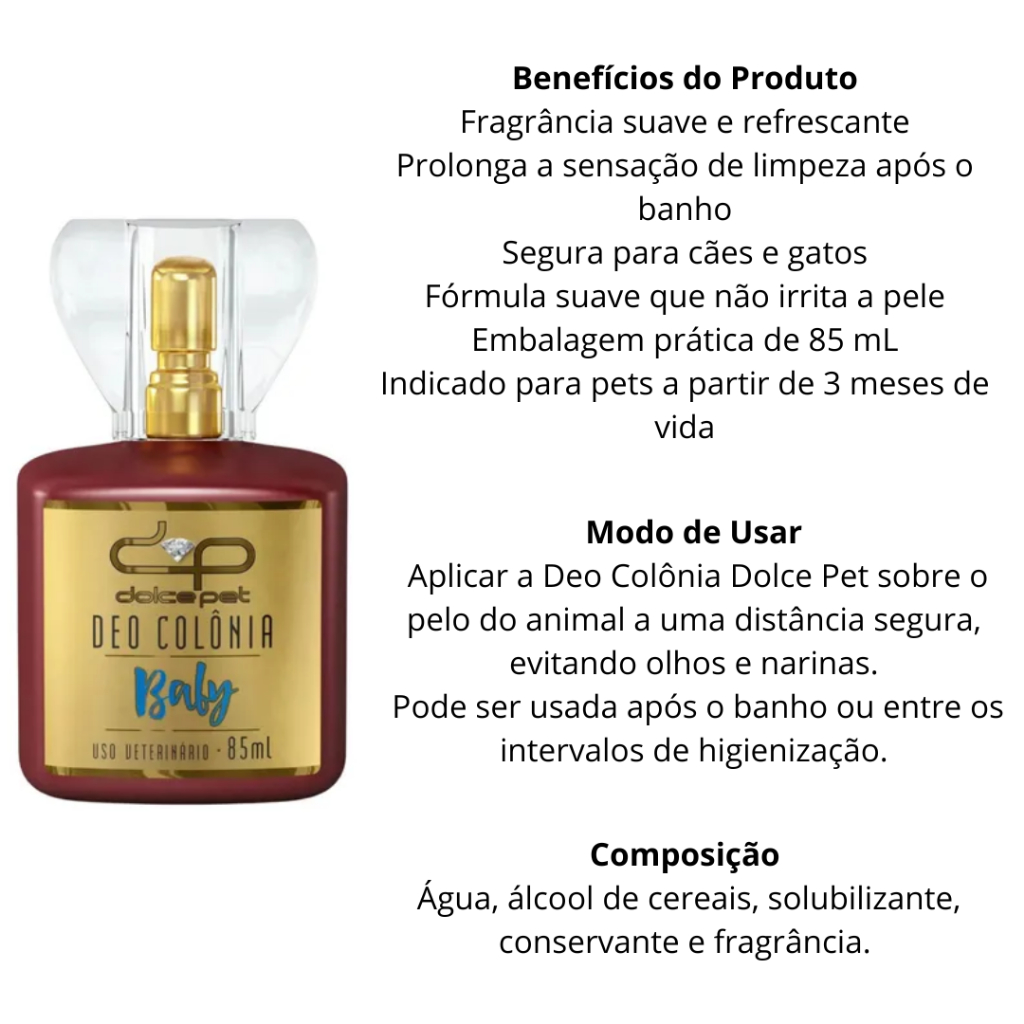 | Deo Colônia Para Cães e Gatos 85ml - Dolce Pet este produto | R$ 57,73 | — | 4.8/5 | — |