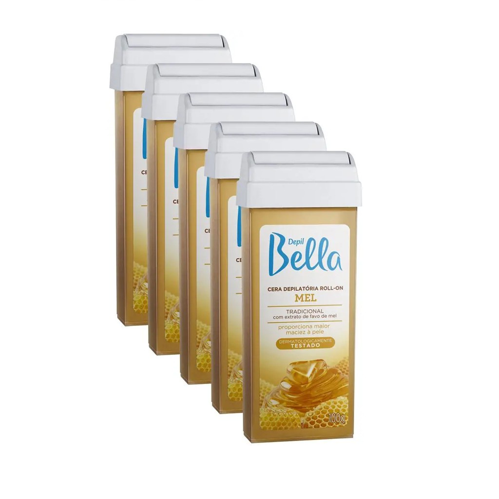 Kit 01 aparelho roll on Mega Bell + 05 Refil cera mel Depil Bella No kit Contém: 01 - Aquecedor bivolt automático, com cabo e interruptor normatizado - Mega Bell 05 - Refil Cera Mel de 100G - Depil Bella. Aparelho Elétrico Bivolt Para Uso Profissional, Com Visor Do Nível De Cera. Design Exclusivo Dispensa O Uso De Suporte. Como usar: 1) Coloque o refil de Cera Roll-On dentro do aparelho/aquecedor, se necessário, ajuste a trava de fixação interna do aparelho, com o auxílio de uma chave de fendas ou ferramenta similar, para firmar o refil. Importante: o aparelho deve estar fora da tomada de energia elétrica para realizar este procedimento. 2) Ligue o aparelho (bivolt automático) e aguarde o aquecimento da cera por aproximadamente 20 minutos. Retire o lacre do roll-on com o refil aquecido. Faça um teste deslizando o refil sobre o lenço para depilação. 3) Faça a limpeza da área a ser depilada. 4) Desconecte o aparelho do plug* e aplique a cera sobre a pele no sentido de crescimento dos pelos, deslizando uma só vez. Quanto mais rápido deslizar o roll-on, mais fina será a camada de cera. 5) Coloque sobre a cera o lenço para depilação e pressione-o para aderir à cera. 6) Com uma das mãos estique a pele e com a outra remova o lenço, puxando rapidamente e em sentido contrário ao crescimento dos pelos. Não reaplique a cera mais de duas vezes na mesma região. Se não conseguir remover totalmente os pelos, utilize a cera que ficou no lenço para fazer os retoques. Nunca tente depilar toda a região de uma só vez. 7) Aplique o óleo removedor para retirar possíveis resíduos de cera da pele. Remova o excesso de óleo da pele e finalize aplicando gel corporal sem álcool para acalmar e suavizar a pele. Precauções: Mantenha fora do alcance de crianças. Nunca ligue o aparelho sem um refil de cera roll-on ou com um refil vazio, sob o risco de provocar superaquecimento e derretimento de partes. Não utilizar esse aparelho próximo de banheiras, pias, chuveiros e outros recipientes com água. Não deixar o aparelho ligado sem ninguém por perto. Nunca transportar/suspender o aparelho pelo cabo.