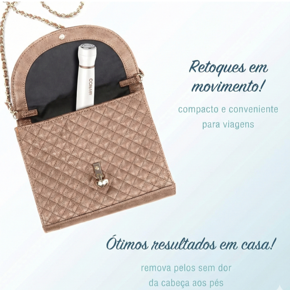 Depilador Sem Fio Conair All In One Compacto Facial e Corporal Feminino Branco - LT85NBR Pele lisinha e impecável onde você estiver! Com o Aparador de Pelos Conair All-In-One, sua rotina de cuidados ficou ainda mais prática e eficiente. Compacto, sem fio e equipado com 4 acessórios incríveis, ele é perfeito para deixar seu rosto e corpo livres de pelos indesejados, seja em casa ou em qualquer lugar! Benefícios que vão te encantar: -Versátil: Ideal para sobrancelhas, buço, bochechas, queixo, áreas do biquíni e muito mais. -Praticidade: Use em pele seca ou molhada, sem irritações e com muita precisão. -Portátil: Funciona com pilhas AA (não inclusas) e é super fácil de levar na bolsa ou em viagens. -Inovação Conair: Lâminas de aço inoxidável para um acabamento profissional, sem sair de casa. Itens Inclusos: - 1 Depilador Conair All-In-One - 1 Aparador de Sobrancelha - 1 Aparador Multiuso - 1 Pente de Detalhe - 1 Pente de Sobrancelha Cuide-se com Conair! Produtos desenvolvidos por especialistas para o seu cuidado completo, da cabeça aos pés. Detalhes: Marca: Conair Cor: Branco Fonte de alimentação: 2 pilhas AA (não inclusas) Modelo: LT85NBR Transforme seu cuidado diário em um momento só seu. Garanta já o seu! Seja bem-vindo(a) à Abre alas! Na Abre alas, oferecemos uma ampla linha de produtos tecnológicos de alta qualidade para facilitar seu dia a dia. Explore nosso catálogo e descubra soluções modernas e eficientes. Estamos aqui para ajudá-lo a encontrar o que você procura! Produto Orignal, lacrado e com nota fiscal. Imagens meramente ilustrativas Garantia de 12 meses com o fabricante Informações fornecidas com base no fabricante Em caso de dúvidas sobre especificações técnicas, uso, restrições e manuseio do produto, consulte o manual do produto