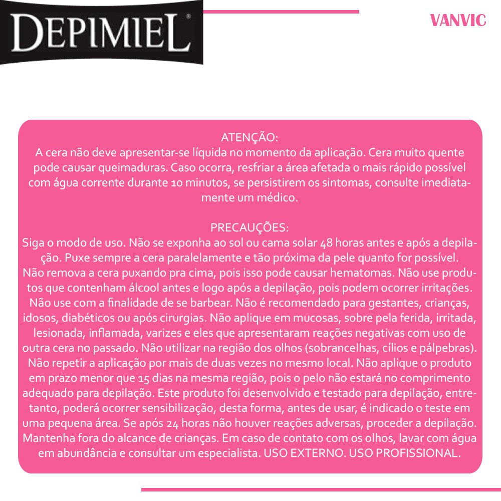 ITENS INCLUSOS: - 1 Cera Depimiel em Tabletes Natural com Mel 1kg. Produto 100% Original, com garantia e nota fiscal. A cera depilatória Natural com Mel - sistema espanhol é um produto de alta qualidade que foi desenvolvido especialmente para depiladoras profissionais. Com uma fórmula única e natural, esta cera é feita com ingredientes cuidadosamente selecionados para garantir uma depilação eficaz e suave. Esta cera é produzida com mel, que é conhecido por suas propriedades hidratantes e calmantes para a pele. Conselho de Aplicação 1) Aqueça a cera na Termocera Depimiel ou coloque-a em um recipiente adequado (metálico), aquecendo em banho-maria ou fogo baixo. 2) Deixe esfriar. Com uma espátula, mexa a cera até que fique com uma consistência homogênea e cremosa. Verifique a temperatura da cera colocando uma pequena quantidade do produto no antebraço. Se estiver em uma temperatura suportável inicie a depilação. 3) Com uma espátula, aplique uma camada fina de cera em direção ao crescimento dos pelos. 4) Deixe secar por alguns segundos , estique a pele e puxe a cera com firmeza e rapidez, em sentido contrário ao crescimento dos pelos. 5) Use o Óleo Removedor DEPIMIEL para retirar possíveis resíduos de cera da pele e finalize com a Loção ou Gel Pós-Depilatório DEPIMIEL. ATENÇÃO: A cera não deve apresentar-se líquida no momento da aplicação. Cera muito quente pode causar queimaduras. Caso ocorra, resfriar a área afetada o mais rápido possível com água corrente durante 10 minutos, se persistirem os sintomas, consulte imediatamente um médico. PRECAUÇÕES: Siga o modo de uso. Não se exponha ao sol ou cama solar 48 horas antes e após a depilação. Puxe sempre a cera paralelamente e tão próxima da pele quanto for possível. Não remova a cera puxando pra cima, pois isso pode causar hematomas. Não use produtos que contenham álcool antes e logo após a depilação, pois podem ocorrer irritações. Não use com a finalidade de se barbear. Não é recomendado para gestantes, crianças, idosos, diabéticos ou após cirurgias. Não aplique em mucosas, sobre pela ferida, irritada, lesionada, inflamada, varizes e eles que apresentaram reações negativas com uso de outra cera no passado. Não utilizar na região dos olhos (sobrancelhas, cílios e pálpebras). Não repetir a aplicação por mais de duas vezes no mesmo local. Não aplique o produto em prazo menor que 15 dias na mesma região, pois o pelo não estará no comprimento adequado para depilação. Este produto foi desenvolvido e testado para depilação, entretanto, poderá ocorrer sensibilização, desta forma, antes de usar, é indicado o teste em uma pequena área. Se após 24 horas não houver reações adversas, proceder a depilação. Mantenha fora do alcance de crianças. Em caso de contato com os olhos, lavar com água em abundância e consultar um especialista. USO EXTERNO. USO PROFISSIONAL.