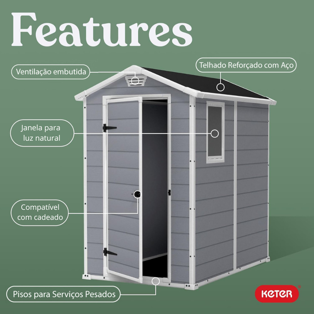 Depósito Multiuso Área Externa Jardim Manor 4x6 Keter Durabilidade e Resistente Depósito Multiuso Área Externa e Jardim Manor 4x6 Keter O Depósito de Jardim Manor 4x6 é uma solução elegante e funcional para organizar e proteger ferramentas, acessórios e itens do dia a dia em ambientes externos. Seu design discreto e moderno combina perfeitamente com o espaço ao ar livre, sendo ideal para criar uma área de armazenamento prática e organizada em quintais, varandas ou entre paredes e cercas. Com capacidade de 3730 litros e um espaço interno de 3.73 metros cúbicos, oferece amplo espaço para guardar tudo o que você precisa de forma segura e acessível. A estrutura do Manor 4x6 é construída com paredes duplas altamente resistentes às intempéries, garantindo proteção contra chuva, sol e vento, enquanto o painel de piso integrado evita o contato direto dos itens com o chão, mantendo-os sempre limpos e secos. Um painel de ventilação embutido assegura a circulação constante de ar no interior, prevenindo a formação de umidade e garantindo maior durabilidade dos objetos armazenados. As dobradiças de metal reforçadas aumentam a estabilidade da estrutura, e a possibilidade de trancar o depósito com cadeado (não incluído) oferece maior segurança para proteger seus pertences. Além disso, o galpão é fácil de montar com o uso de ferramentas simples e conta com dimensões externas de 130 cm de largura, 192 cm de profundidade e 198 cm de altura, otimizando espaços sem abrir mão de funcionalidade. Internamente, suas dimensões de 111 cm de largura, 177 cm de profundidade e 190 cm de altura proporcionam espaço suficiente para armazenar desde ferramentas de jardinagem até equipamentos maiores. Ideal para quem busca organização, praticidade e segurança em um só produto. Especificações: - Capacidade: 3.73 m³ (131.8 pés cúbicos) - Material:Resina de polipropileno reforçada com aço - Dimensões externas: 130 cm (L) x 192 cm (P) x 198 cm (A) - Dimensões internas (L x P x A): 111 cm x 177 cm x 190 cm - Construção: Paredes duplas resistentes às intempéries - Painel de piso integrado: Proteção contra sujeira e umidade - Ventilação embutida: Previne umidade e garante circulação de ar - Segurança: Fechadura com suporte para cadeado (não incluído) - Montagem: Fácil, utilizando ferramentas domésticas comuns - Peso suportado: Até 367 kg (809.4 lbs) distribuídos no piso *Garantia: 12 meses contra defeitos de fabricação. *Imagens Meramente Ilustrativas. *Objetos de decoração das fotos não estão inclusos. *As cores podem variar conforme monitor/smartphone utilizado para a visualização do anúncio. *Não oferecemos serviço de montagem dos produtos, porém, acompanham esquema de montagem na embalagem