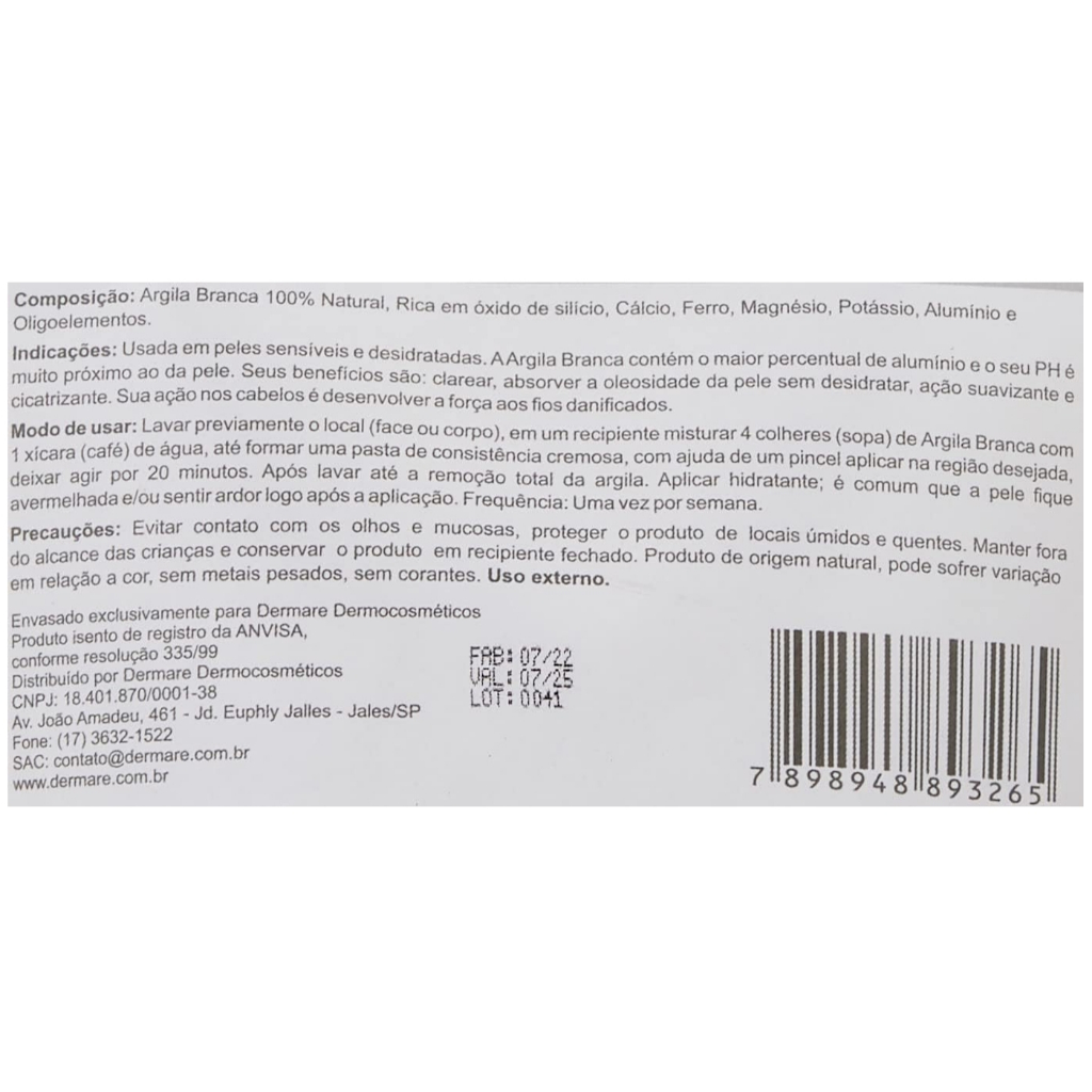 A Argila Branca Dermare é 100% natural e esterilizada, desenvolvida para purificar, acalmar e revitalizar a pele. Rica em silício, alumínio e zinco, promove efeito detox suave, ajuda a clarear manchas e controla a oleosidade sem ressecar. Com textura fina e pura, é livre de metais pesados e conservantes, garantindo segurança para peles sensíveis e reativas. Pode ser usada em máscaras faciais, corporais ou capilares, oferecendo cuidado eficaz e delicado. Produto hipoalergênico, vegano, cruelty-free e de grau profissional, ideal para protocolos estéticos e home care. Sobre este item A Argila Branca Dermare purifica, suaviza e revitaliza a pele com ação clareadora natural Rica em silício, alumínio e zinco, estimula a regeneração celular e o viço da pele. Acalma peles sensibilizadas após limpeza, peeling ou depilação. Controla a oleosidade, ajuda a uniformizar o tom da pele e suaviza manchas. Indicada para todos os tipos de pele, especialmente as sensíveis e reativas.