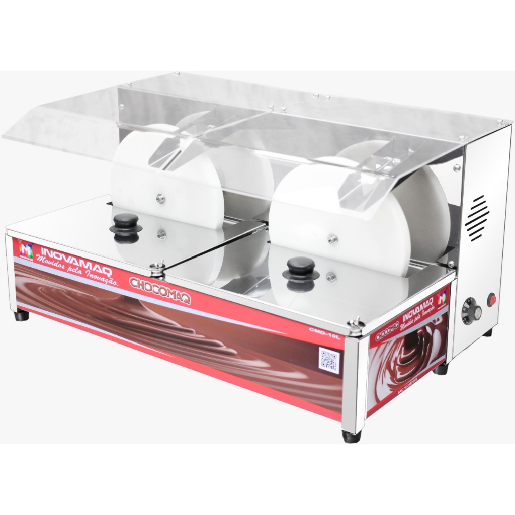 DESCRIÇÃO TÉCNICA DO PRODUTO: - As derretedeiras com 2 discos giratórios para chocolate - Inovamaq são perfeitas para derreter o chocolate de forma prática, cobrir frutas, pão de mel, bombom e coletar chocolates em formas de forma de rápida e eficiente. - Através do sistema de aquecimento por “banho-maria”, aquece e derrete o chocolate de forma eficiente conservando a consistência e o sabor do chocolate. - As derretedeiras com disco giratório para chocolate - Inovamaq são fabricadas em aço inoxidável 430 polido e possuem cubas gastronômicas removíveis que facilitam o trabalho. As cubas gastronômicas são em aço 304 (material indicado para contato com o alimento), além disso, possuem tampas com puxador em nylon em todos os modelos. - O termostato regulável de 30 a 120ºC (+/-10ºC) permite que você defina a temperatura ideal para derreter ou manter o chocolate aquecido. - Possui disco em poliacetal de 20mm e Bico dosador removível. - São ideais para profissionais em chocolates, confeitarias, cafeterias, sorveterias, açaizeiros, docerias, buffet e eventos. DADOS TÉCNICOS: Capacidade: 2 cubas – 5 kg Altura: 350mm, Largura: 620mm, Profundidade: 450mm Consumo: 1010W / 0,91kw/h Alimentação: 127V ou 220v O QUE HÁ DE NOVO: Tampa em aço Inoxidável. Disco em Poliacetal atóxico. Motor com de alto torque Proteção em acrílico. Bico dosador removível