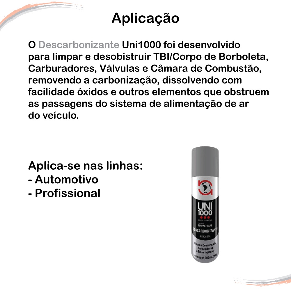 CONTEÚDO DA EMBALAGEM: 01 Descarbonizador Aerossol O Descarbonizante Uni1000 foi desenvolvido para limpar e desobistruir TBI/Corpo de Borboleta, Carburadores, Válvulas e Câmara de Combustão, removendo a carbonização, dissolvendo com facilidade óxidos e outros elementos que obstruem as passagens do sistema de alimentação de ar do veículo. Aplicação Veículos em Geral - Carburadores - Bicos Injetores Dados do Descarbonizador: - Alta Performance - Remoção de Borra / Carvão - Estabiliza Marcha Lenta - Redução de Consumo - Redução de Poluentes - Dispensa a desmontagem do Motor Dados Técnicos: EAN: 7896086106810 Marca: Uni 1000 Código Universal: 87108 300 ml História A Shoppeças é uma empresa especializada em E-COMMERCE, e disponibilizamos um portfólio de mais de 30 mil itens no setor Automotivo, nos segmentos de ferragens automotivas (fechaduras, maçanetas, cilindros, trincos de quebra vento), máquinas do vidro elétricas e manuais, tampas automotivas, borrachas de vedação, linha de suspensão e direção, amortecedores mola a gás, acessórios automotivos e palhetas. Todos com portfólio completo para linha leve, pesada, pick-ups e vans. Envios Realizamos todos os nossos envios em até 24 horas após o faturamento.