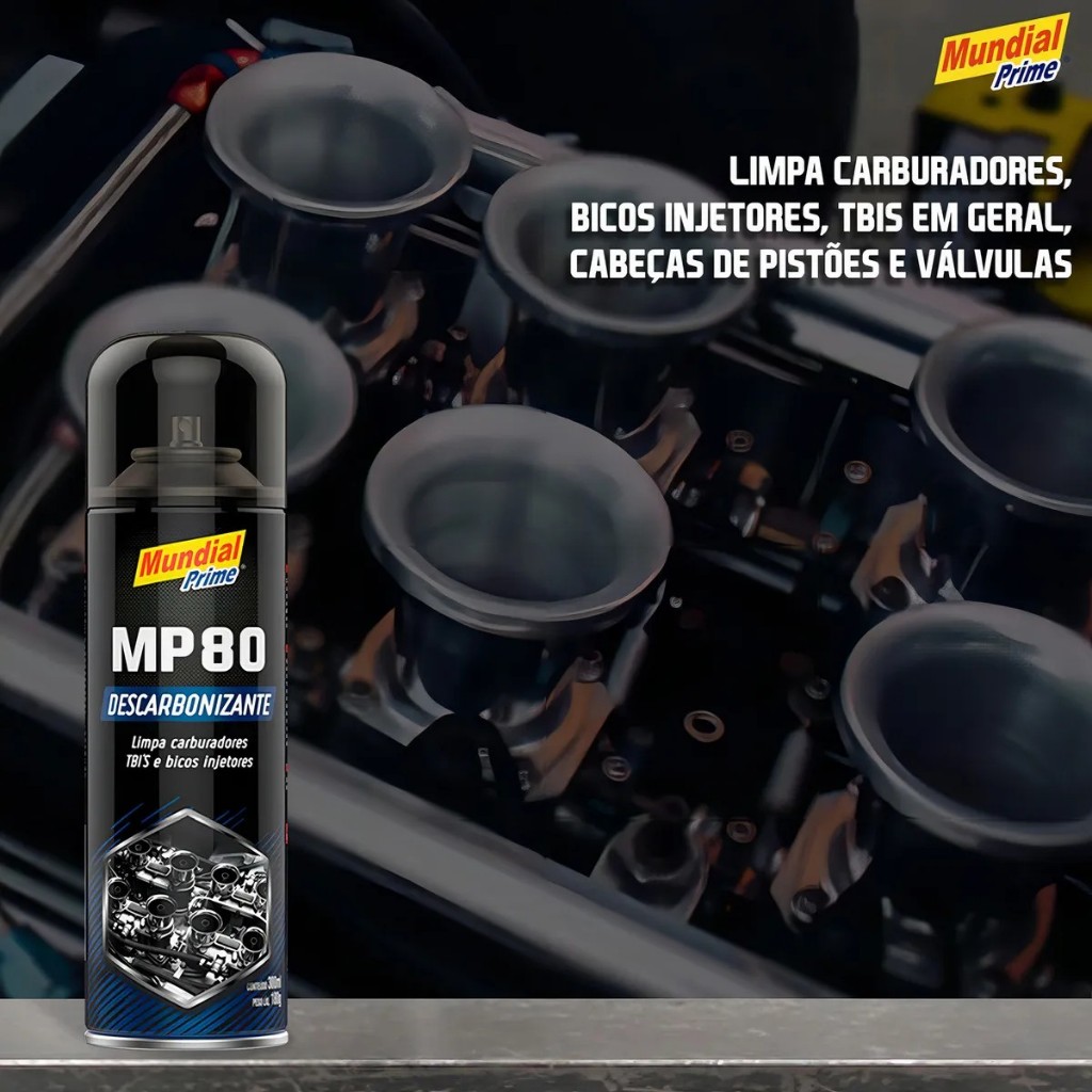 DESCARBONIZANTE MP80 300ml Produto desenvolvido para remover completamente as crostas do sistema carburado e de alguns componentes de injeção eletrônica. Instruções de uso: Agite antes de usar. Aplique o produto sobre as peças a serem limpas. Para sistema carburado: desconecte a mangueira de entrada do filtro. Vede a saída. Ligue o motor e aplique o produto com o bico prolongador, diretamente através do filtro. Para limpeza completa do sistema, recomenda-se usar todo o conteúdo desta embalagem. Aplicações Carburadores, bicos injetores, TBIs em geral, cabeças de pistões e válvulas.