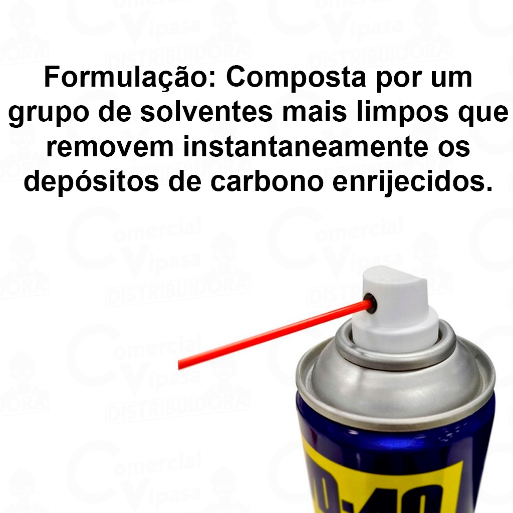 COMERCIAL VIPASA DISTRIBUIDORA. Descarbonizante Spray WD40 470ml SPECIALIST Ação Dupla Rápida Removedora Profissional Alta Limpeza Descarbonizante Spray WD40 470ml SPECIALIST Ação Dupla Rápida Removedora Profissional WD-40 Specialist Descarbonizante remove com facilidade os depósitos de carbono enrijecidos em carburadores e motores. Poderosa fórmula com dupla ação removedora. Descarbonizante Spray WD40 470ML SPECIALIST Ação Dupla Rápida Removedora Descrição Do Produto Descarbonizante Spray WD40 470ML SPECIALIST - - Características Gerais do Produto: • Modelo: WD40 Specialist descarbonizante Aerosol • Marca: WD40 • Embalagem: 380g / 470ml Aerosol • Formulação: Composta por um grupo de solventes mais limpos que removem instantaneamente os depósitos de carbono enrijecidos. • Instruções de Uso: Aplique diretamente nas peças e superfícies para lubrificar, proteger, limpar, eliminar umidade e penetrar.; Mantenha afastado do calor/faísca/chama aberta/superfícies quentes. – Não fume.; Não pulverize sobre chama aberta ou outra fonte de ignição.; Não perfure ou queime, mesmo após o uso.; Evite inalar as poeiras/fumos/gases/névoas/vapores/aerossóis.; Lave cuidadosamente após o manuseio.; Utilize apenas ao ar livre ou em locais bem ventilados.; Use luvas de proteção/roupa de proteção/proteção ocular/proteção facial.; • Características: Tecnologia que quebra os depósitos de carbonização e minimiza o excesso de pulverização e desperdício. • Ideal Para: Limpar carburadores e partes de motores de automóveis e caminhões, motocicletas, cortadores de grama, e barcos. COMERCIAL VIPASA DISTRIBUIDORA.