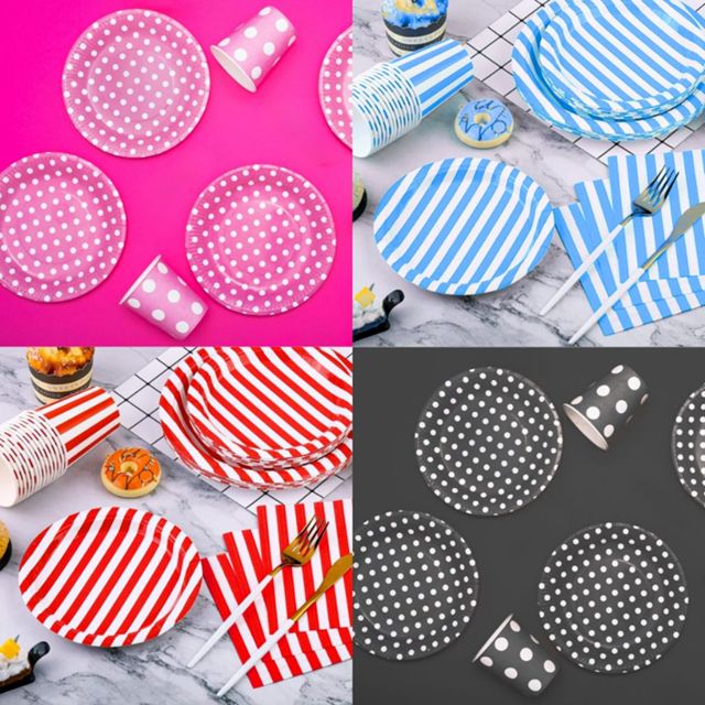 Descartáveis: 8 Copos 250ml + 8 Pratinhos de Festa Papel Bolinha Listras Estampado Aniversário