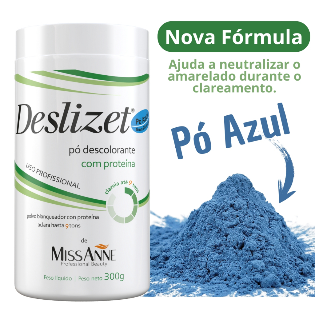 Pó Descolorante Deslizet Miss Anne – Pó Azul Profissional 💫 Descrição do Produto O Pó Descolorante Deslizet Miss Anne foi desenvolvido para quem busca clareamento rápido, seguro e uniforme. Sua fórmula enriquecida com proteínas protege os fios durante o processo químico, mantendo a hidratação e a resistência capilar. Ideal para mechas, luzes, reflexos, balayagens e descolorações totais, o Pó Azul ajuda a neutralizar o amarelado, proporcionando um tom mais limpo e luminoso. 🌟 Benefícios Clareamento rápido e eficaz Protege e hidrata os fios durante o processo Fórmula com proteínas fortalecedoras Reduz o ressecamento e quebra do cabelo Indicado para técnicas diversas de descoloração Pó azul, que ajuda a manter o tom mais frio e uniforme 🧴 Modo de Uso Em um recipiente não metálico, misture o pó descolorante com água oxigenada (20 a 40 volumes) até formar uma textura cremosa. Aplique sobre os cabelos secos, sem lavar previamente. Deixe agir até atingir o tom desejado, observando o clareamento. Enxágue abundantemente e finalize com uma máscara hidratante ou reconstrutora. ⚙️ Características Principais Tipo: Pó Descolorante Azul Indicação: Todos os tipos de cabelo Uso: Profissional ou doméstico (com cuidado) Textura: Leve, fácil de misturar e aplicar Resultados: Clareamento rápido, uniforme e com brilho