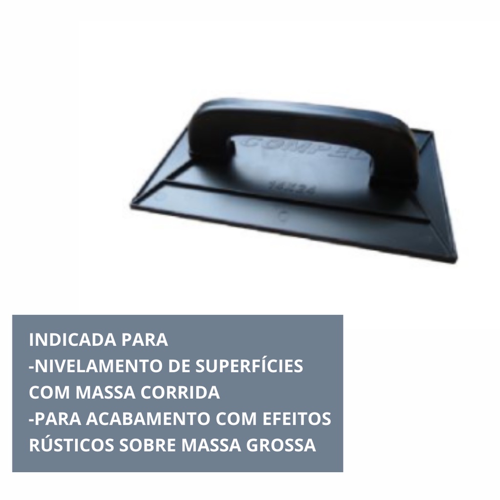 Especificações do Produto: - Desenvolvida com base de PVC selecionado e resistente. - Cabo plástico anatômico. - Base alveolada - Cor : Preta - Medidas: 14cm x 24cm As cores da alça da desempenadeira podem variar Indicações: - Nivelamento e revestimento de superfícies com massa grossa. - Acabamentos com efeitos decorativos rústicos,sua base alveolada facilita a aplicação do produto utiizado. - Excelente para dar acabamentos planos e regulares em superfícies. Limpeza e Conservação: - Após o uso, lavar com água corrente e sabão. - Secar à sombra e guardar em local seco e arejado.